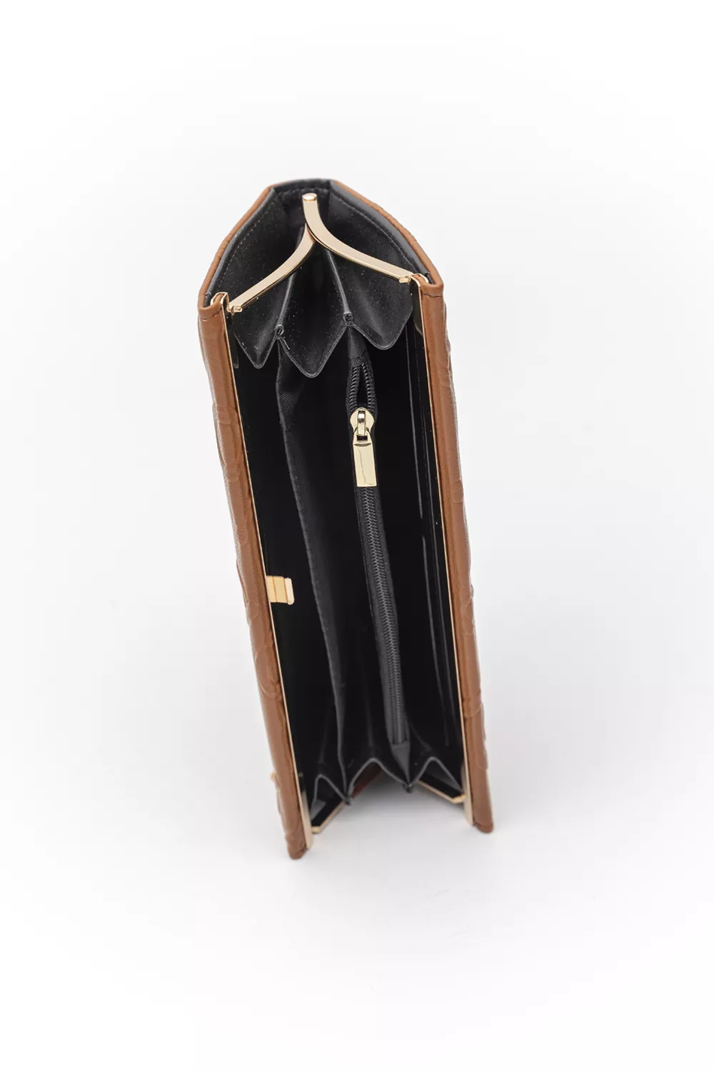 Πορτοφόλι με καινοτόμο άνοιγμα με μεταλλικά ελάσματα. Στο εσωτερικό του υπάρχουν όλες οι απαραίτητες θήκες ενός πορτοφολιού. Το συγκεκριμένο πορτοφόλι μπορεί να χρησιμοποιηθεί και ως clutch.Υλικό: Οικολογικό δέρμα με ανάγλυφο το λογότυπο της εταιρίας σε mirror printing ή μεταλλικά κρακελέ χρώματα.