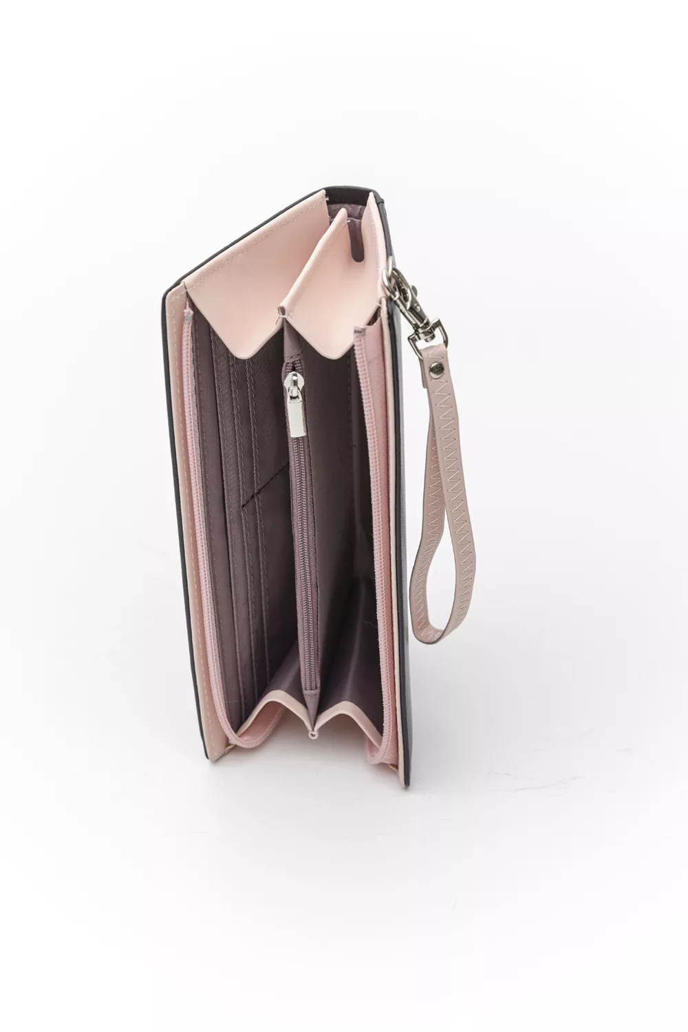 Μεγάλο πορτοφόλι με περικάρπια λαβή για να χρησιμοποιείται και σαν τσαντάκι! Στο εσωτερικό διαθέτει πολλές θέσεις για κάρτες και έξτρα θήκη με φερμουάρ για τα ψιλά.Υλικό: Οικολογικό δέρμα.