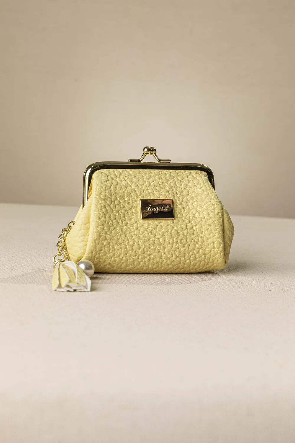 Φοδραρισμένη κερματοθήκη με έναν ενιαίο χώρο που κλείνει με μεταλλικό στόμιο. Διακοσμητική φούντα από συνθετικό υλικό και πέρλα, που προσδίδει κάτι ξεχωριστό και χαριτωμένο.