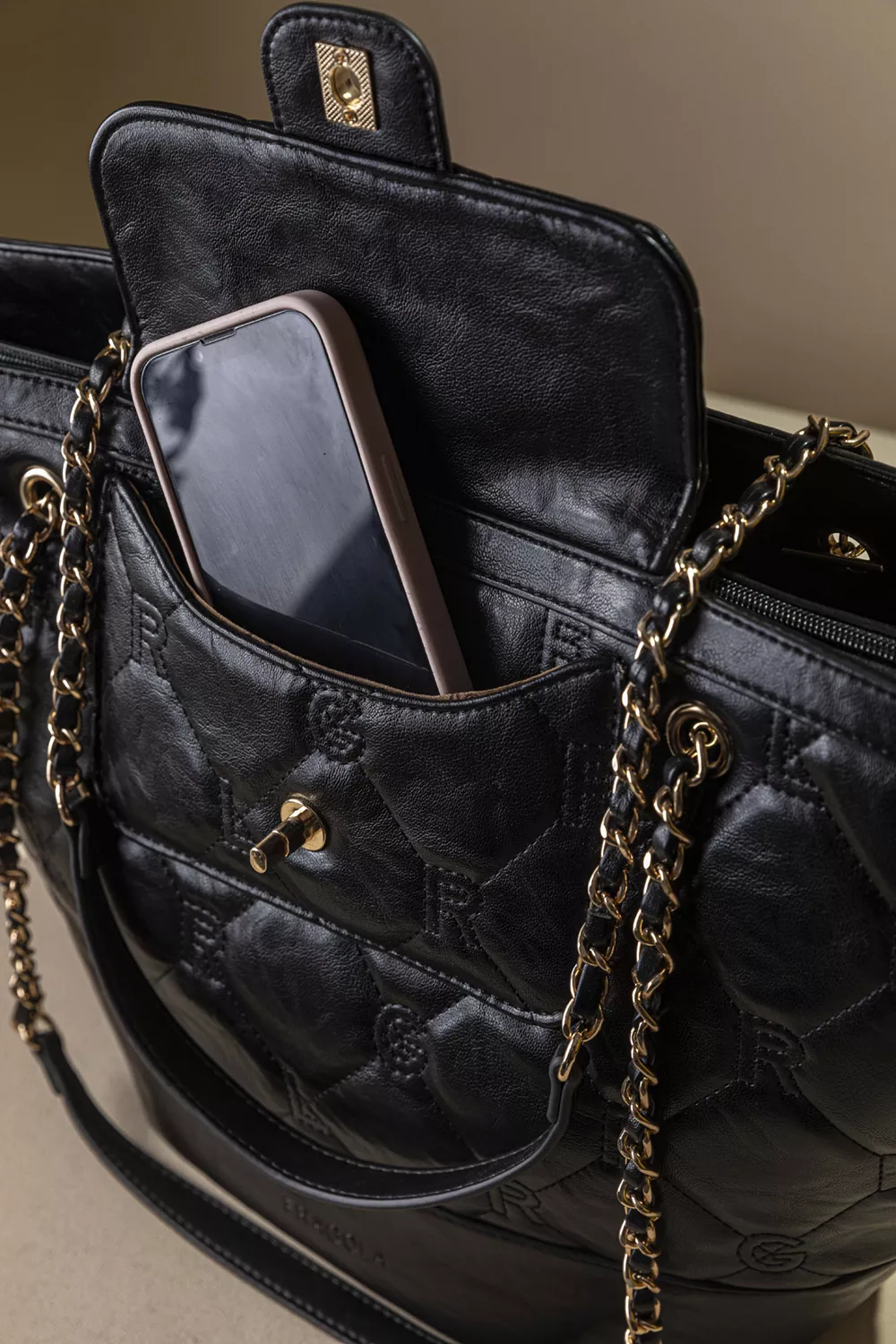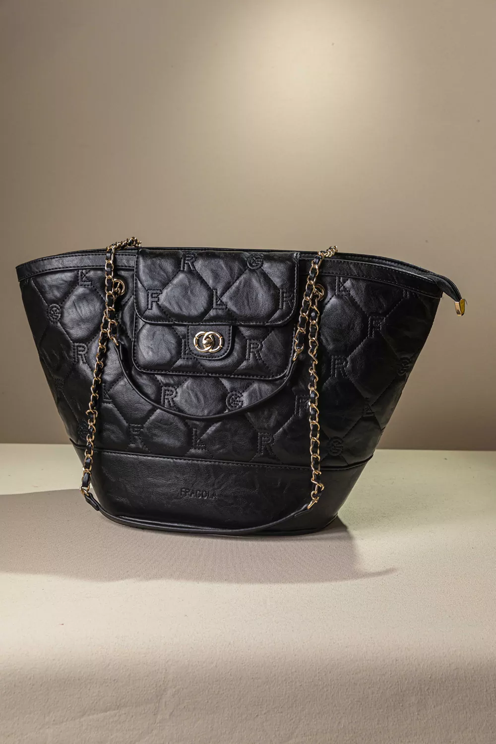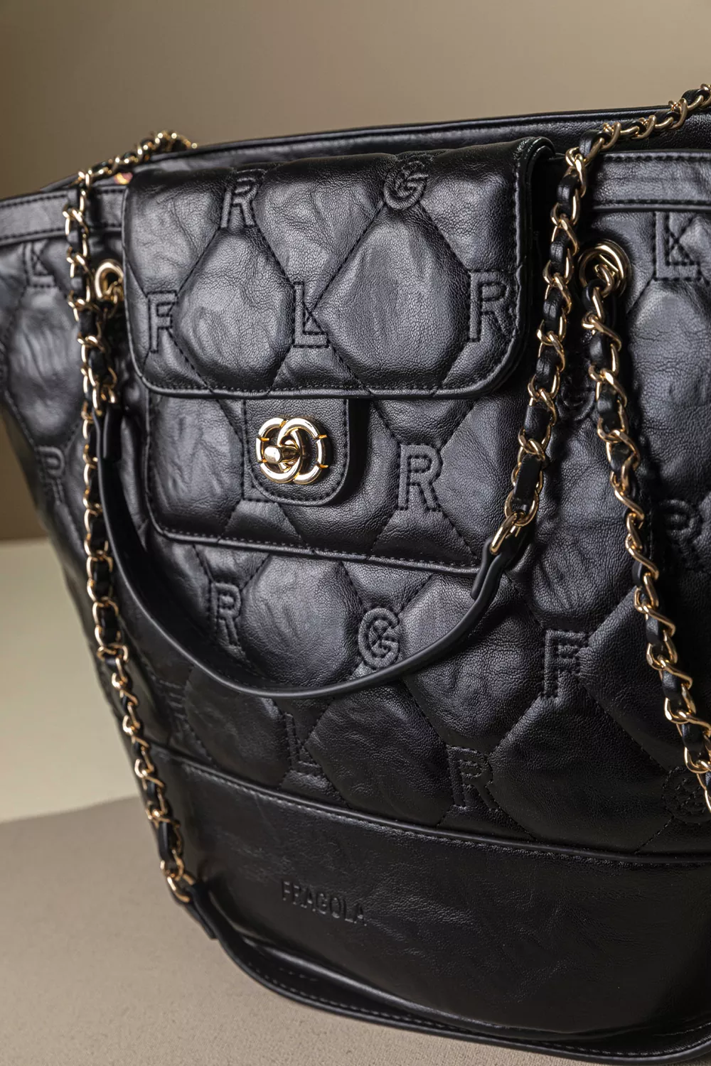 • Καπιτονέ σχέδιο με γαζιά που απεικονίζει τα γράμματα της εταιρείας. Χρυσές μεταλλικές λεπτομέρειες που χαρίζουν πολυτελή εμφάνιση.
