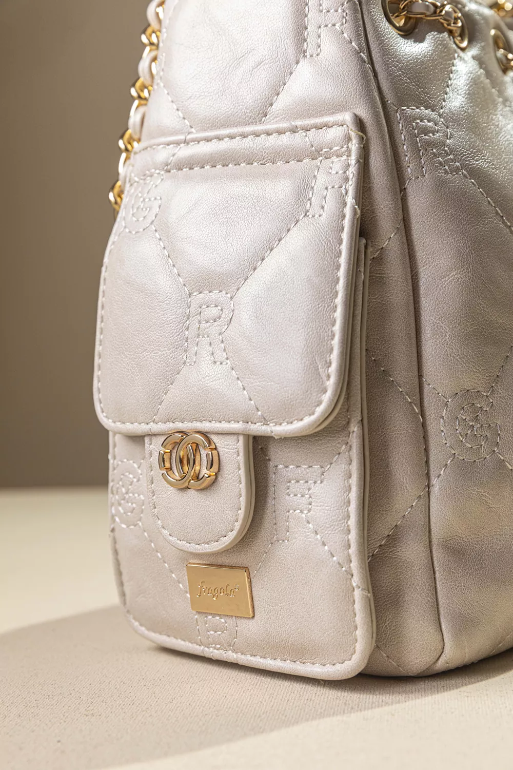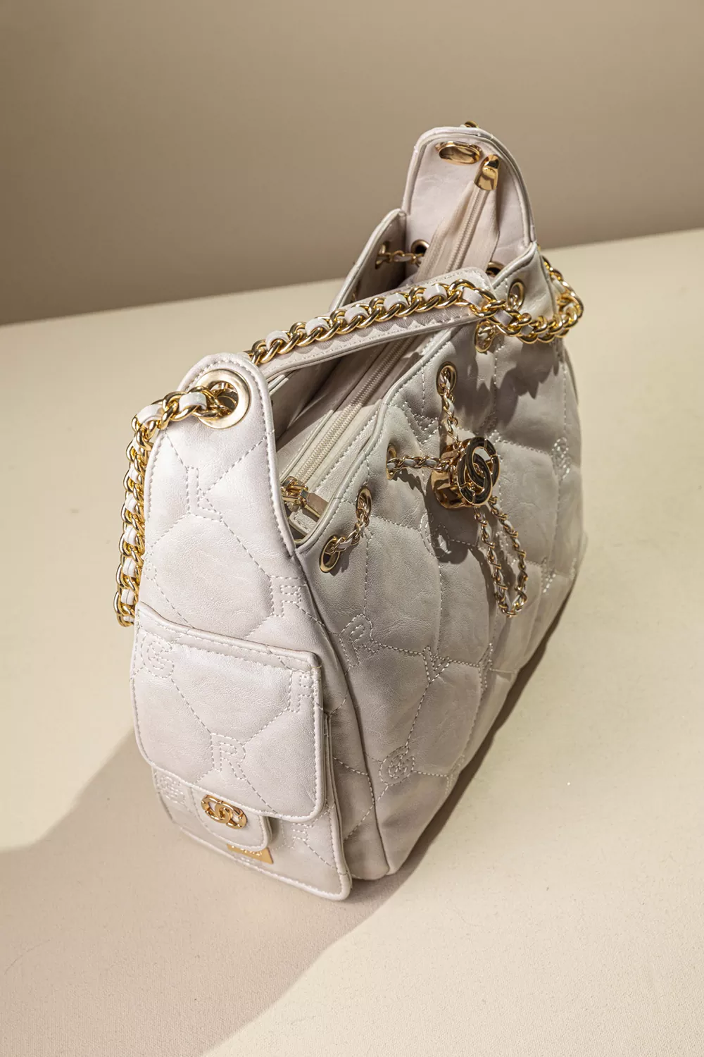 • Γυναικεία τσάντα ώμου κατασκευασμένη από μαλακό συνθετικό δέρμα με παλαιωμένη όψη και καπιτονέ γαζιά που απεικονίζουν τα γράμματα της εταιρείας.