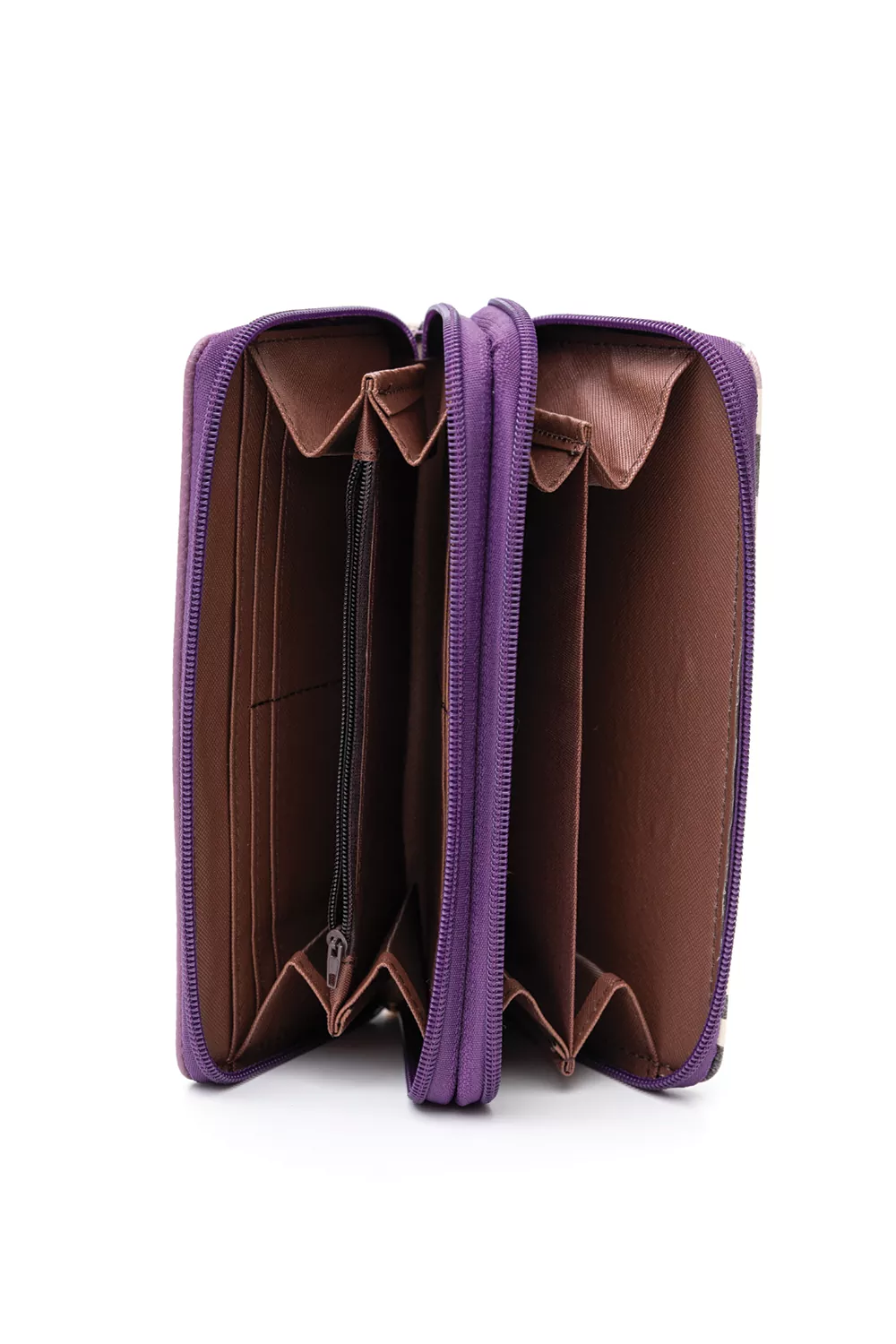 Πορτοφόλι διπλά ανοιγόμενο. Από τη μια πλευρά διαθέτει μια διθέσια θέση για κέρματα και δύο χώρους με φυσούνα χρηστικούς για διάφορα χαρτιά ή σημειώσεις και κλείνει με φερμουάρ. Από την άλλη διαθέτει θέση για χαρτονομίσματα, ταυτότητα, δίπλωμα και πολλές θέσεις για κάρτες. Κλείνει με γλωσσάκι που έχει σούστα.