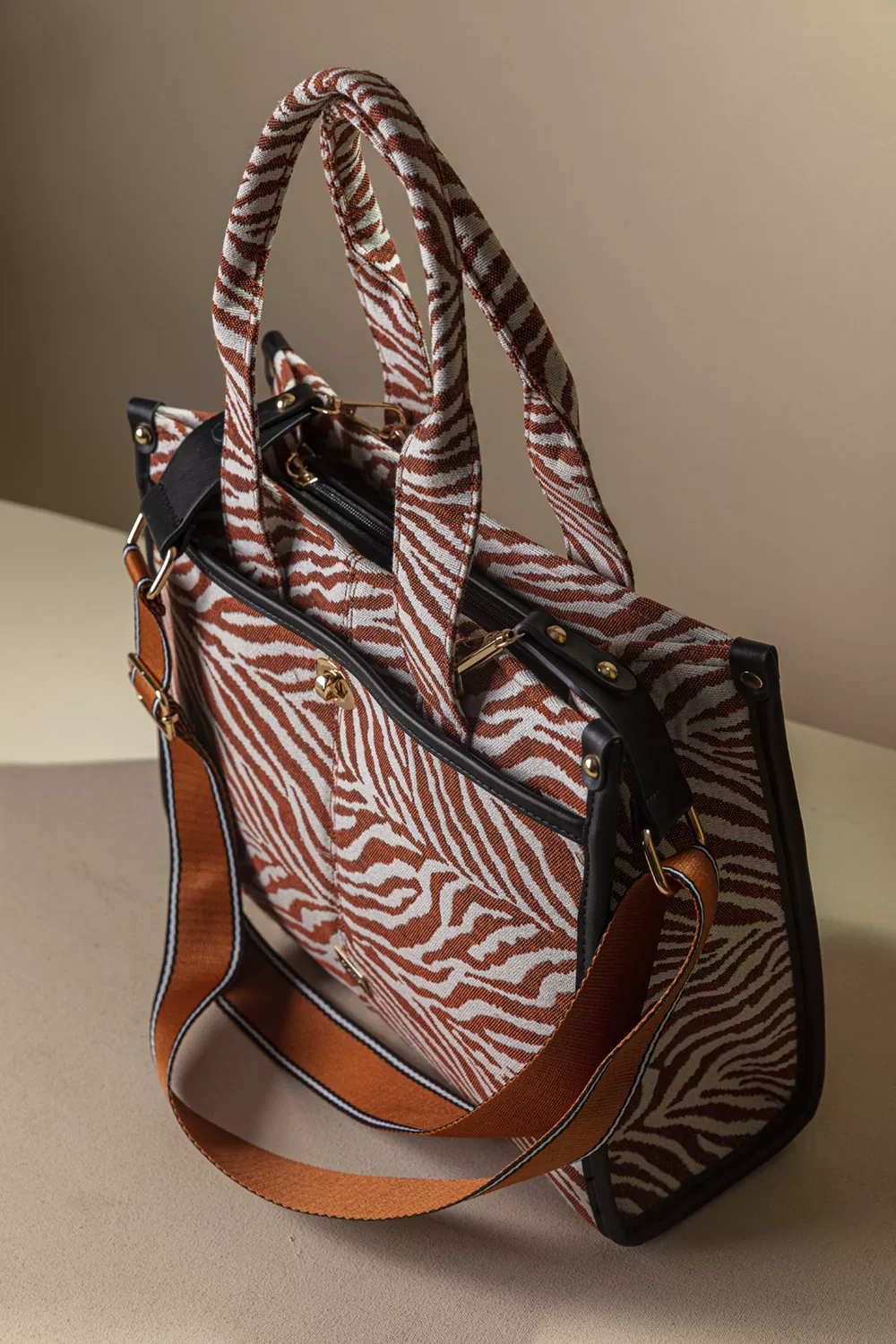 • Κομψή και μοντέρνα υφασμάτινη τσάντα, με εντυπωσιακά υφάσματα σε animal prints. Ιδανική για να δώσει χαρακτήρα σε κάθε σου εμφάνιση.
