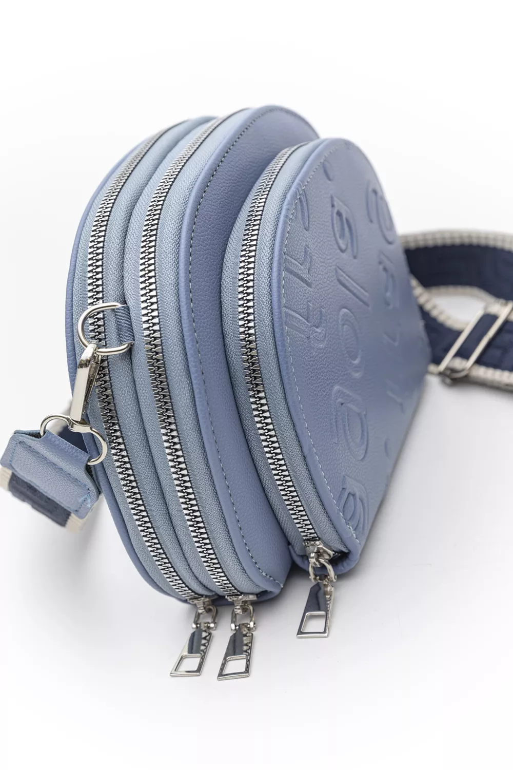 Χιαστί τριθέσιο τσαντάκι σταθερό για όλες τις ώρες της ημέρας. Πολλές βοηθητικές θήκες στο εσωτερικό του. Με αυξομειούμενο μαλακό ιμάντα. Υλικό: Οικολογικό δέρμα με ανάγλυφο το λογότυπο της εταιρίας σε mirror printing.