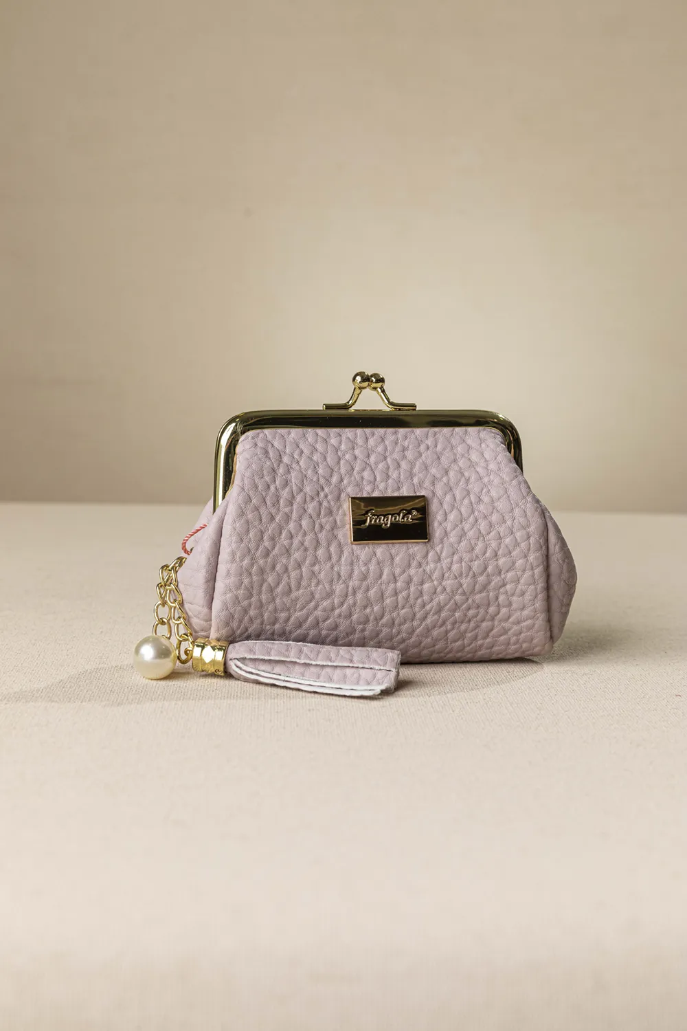 Φοδραρισμένη κερματοθήκη με έναν ενιαίο χώρο που κλείνει με μεταλλικό στόμιο. Διακοσμητική φούντα από συνθετικό υλικό και πέρλα, που προσδίδει κάτι ξεχωριστό και χαριτωμένο.