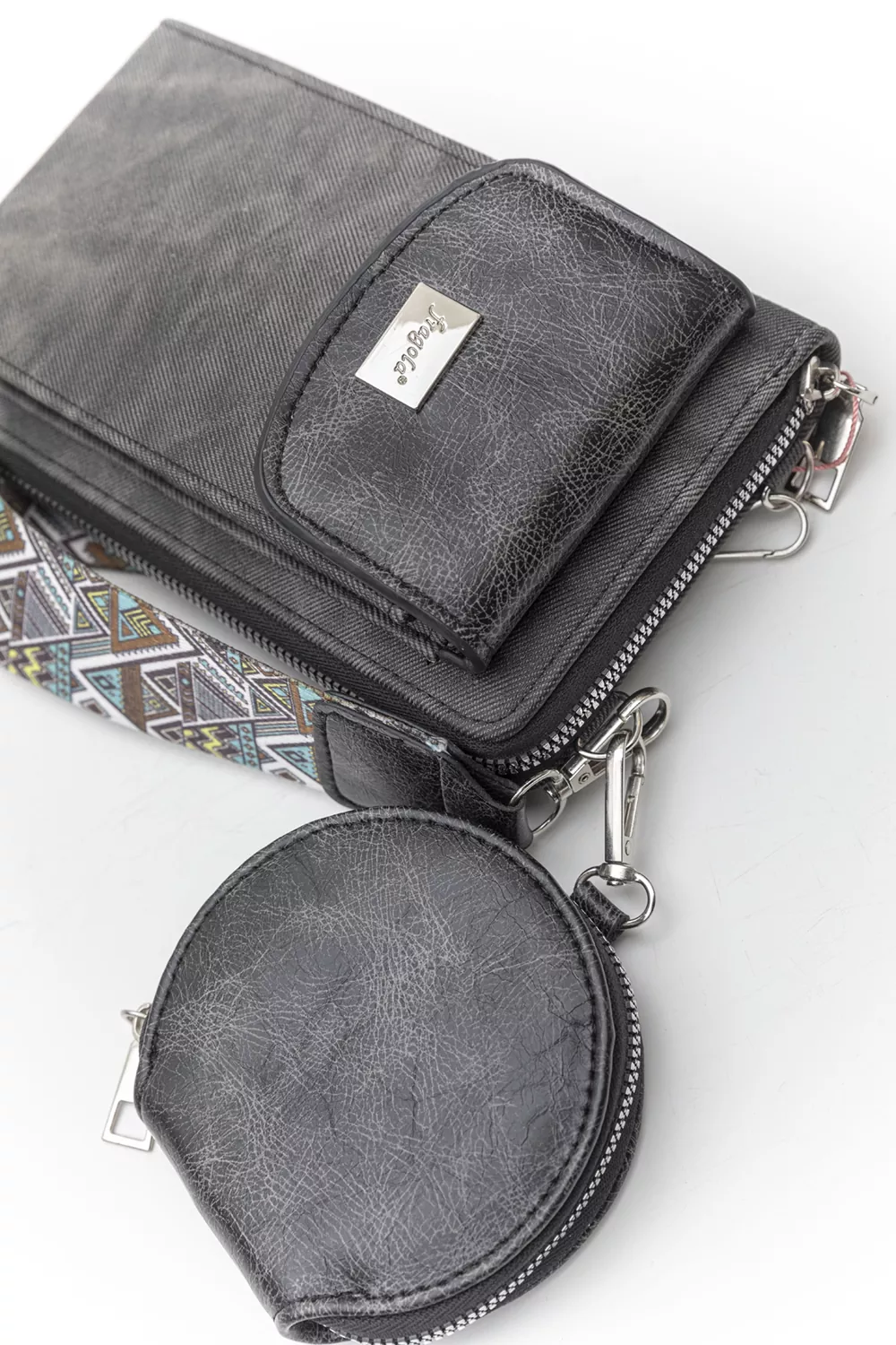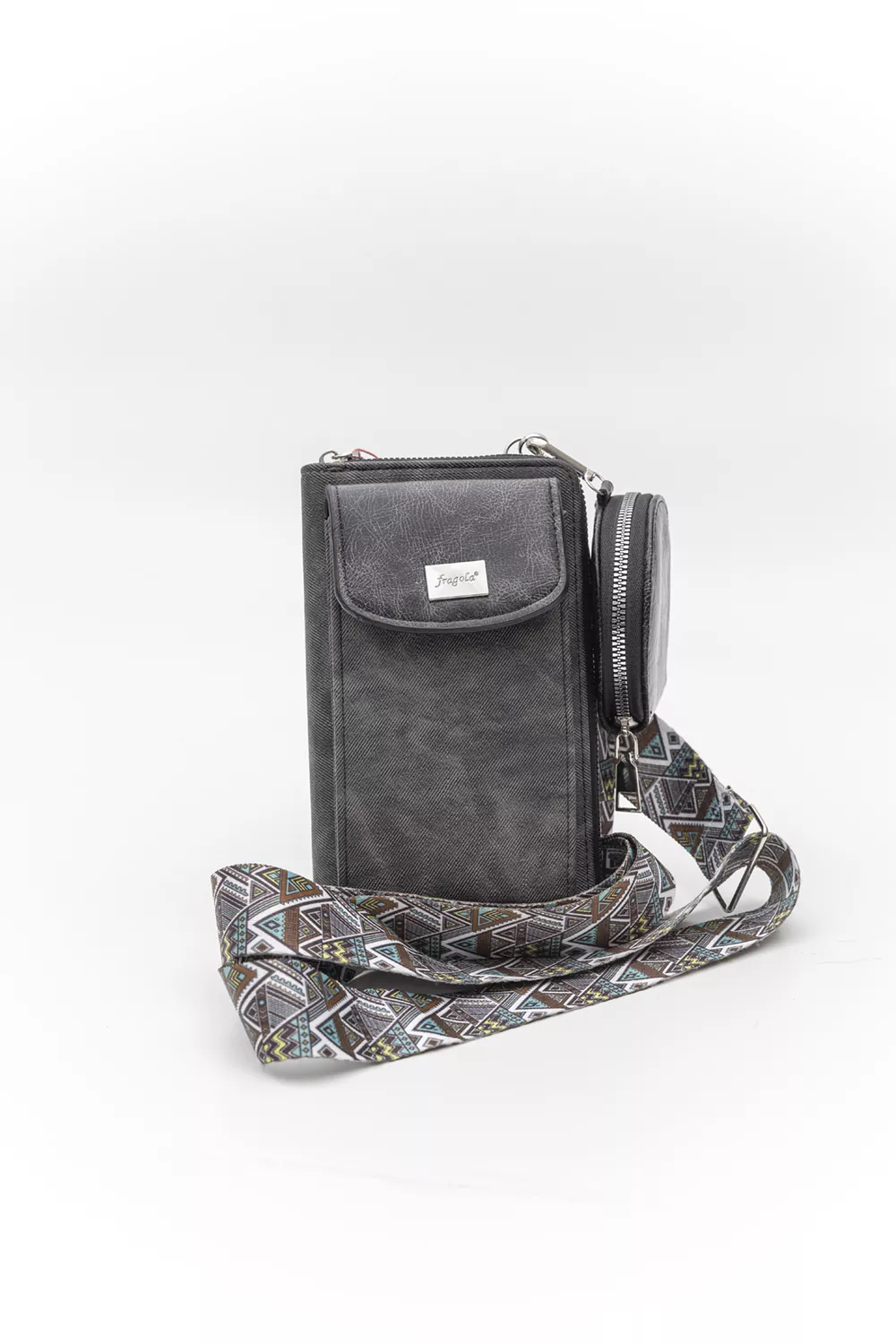 Χιαστί τσαντάκι δύο όψεων (κινητό-πορτοφόλι). Η μια όψη είναι θέση κινητού με καπάκι. Η δεύτερη όψη είναι πορτοφόλι με όλους τους απαραίτητους χρηστικούς χώρους . Συμπεριλαμβάνει έξτρα στρόγγυλη θήκη με φερμουάρ για usb, ακουστικά κλπ.Υλικό: Vintage οικολογικό δέρμα συνδυασμένο με απομίμηση jean υφάσματος σε οικολογικό δέρμα.
