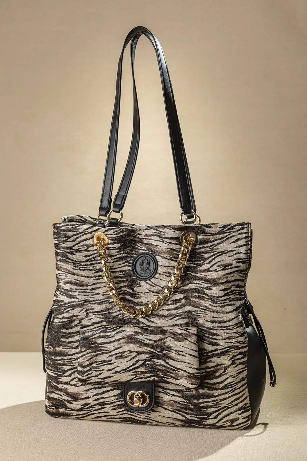 Μια πανάλαφρη τσάντα ώμου και χερός που κλείνει με μαγνητικό button. Διαθέτει "χεράκια" δερματίνης για τον ώμο αλλά και κοντές αλυσίδες για κράτημα στο χέρι αλλά και για έξτρα στιλ. Στο μπροστά μέρος της διαθέτει τσεπάκι που κλείνει με μεταλλική κλειδαριά. Ένας ενιαίος χώρος εσωτερικά που διαθέτει όλα τα κλασικά μικροτσεπάκια με φερμουάρ και χωρίς. Με έξυπνη αυξομείωση του φάρδους της τσάντας από τα πλαινά της μέρη. Υλικό: Συνθετικό δέρμα με υφή και print φιδιού και tiger print.