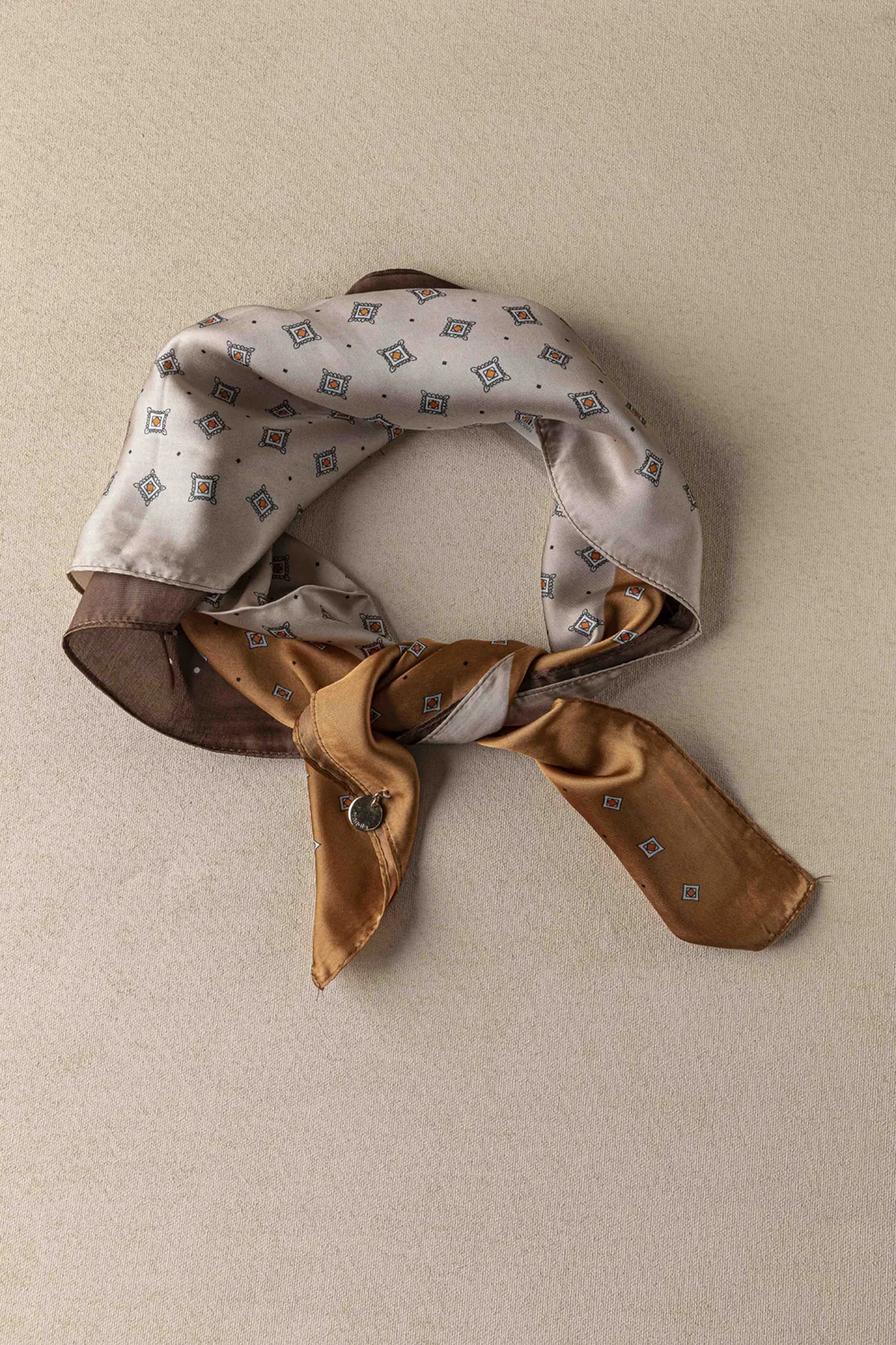 Κομψό και ευέλικτο, αυτό το τετράγωνο μαντήλι προσθέτει στιλ σε κάθε εμφάνιση. Κατασκευασμένο από υψηλής ποιότητας πολυεστέρα με σατέν υφή, προσφέρει απαλή αίσθηση και διακριτική λάμψη που θυμίζει μετάξι. Ιδανικό για να φορεθεί στον λαιμό, να δεθεί στα μαλλιά ή να διακοσμήσει την τσάντα σας, αποτελεί το απόλυτο αξεσουάρ που συνδυάζει πρακτικότητα και κομψότητα. Διαθέσιμο σε μοντέρνα prints και χρώματα που θα ανανεώσουν άμεσα το καθημερινό σας look.