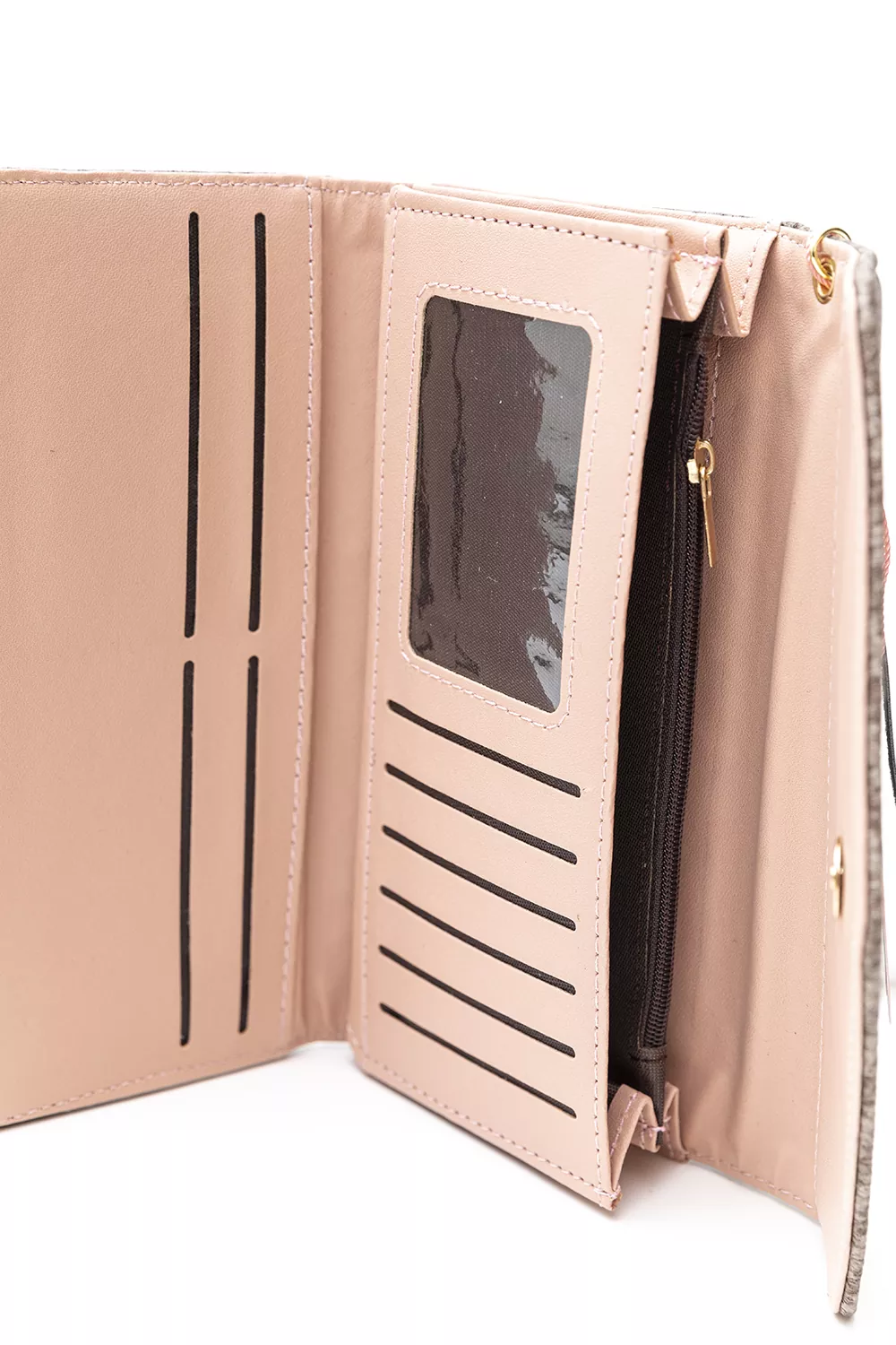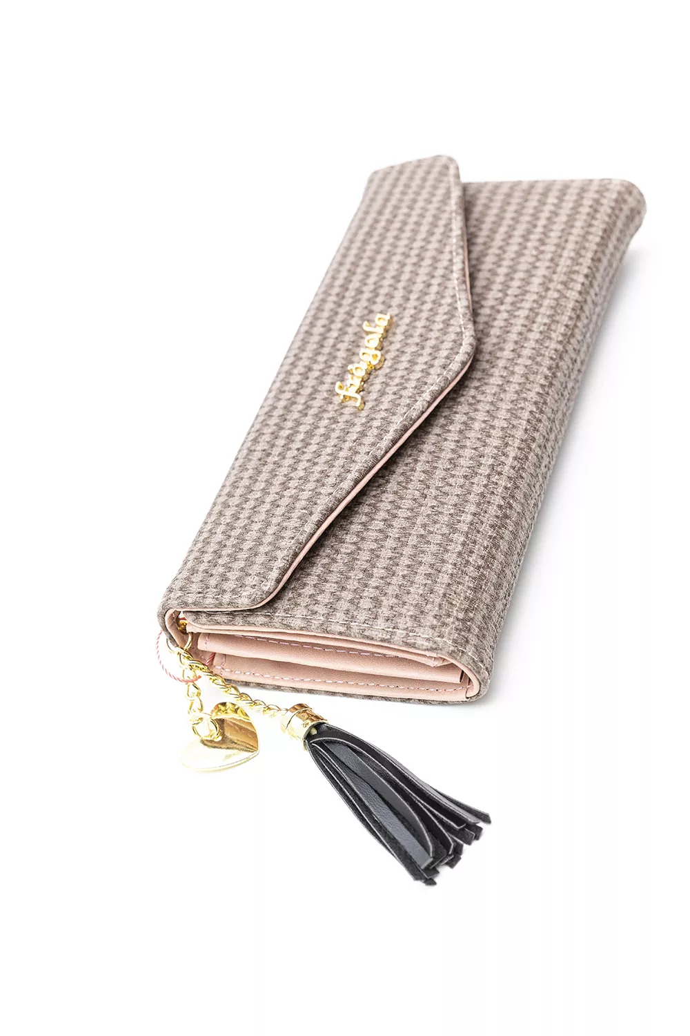 Πορτοφόλι φάκελος με εσωτερική τσέπη με φερμουάρ για τα κέρματα. Θέσεις χαρτονομισμάτων, καρτών και διαφόρων εγγράφων. Κλείνει με σούστα.Οι διακοσμητικές λεπτομέρειες με τη φούντα από το υλικό του πορτοφολιού αλλά και τη μεταλλική καρδούλα το κάνουν χαριτωμένο και ξεχωριστό.Υλικό: Συνθετικό δέρμα