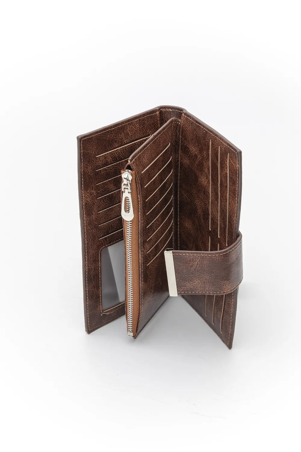 Μεγάλο πορτοφόλι με γλώσσα με μαγνητικό button. Στο εσωτερικό υπάρχουν πολλές θήκες για κάρτες και έξτρα μεγάλες θέσεις για την ταυτότητα και τις σημειώσεις σας. Διαχωρισμένη θήκη με φερμουάρ για τα ψιλά.Υλικό: Vintage οικολογικό δέρμα συνδυασμένο με απομίμηση jean υφάσματος σε οικολογικό δέρμα.
