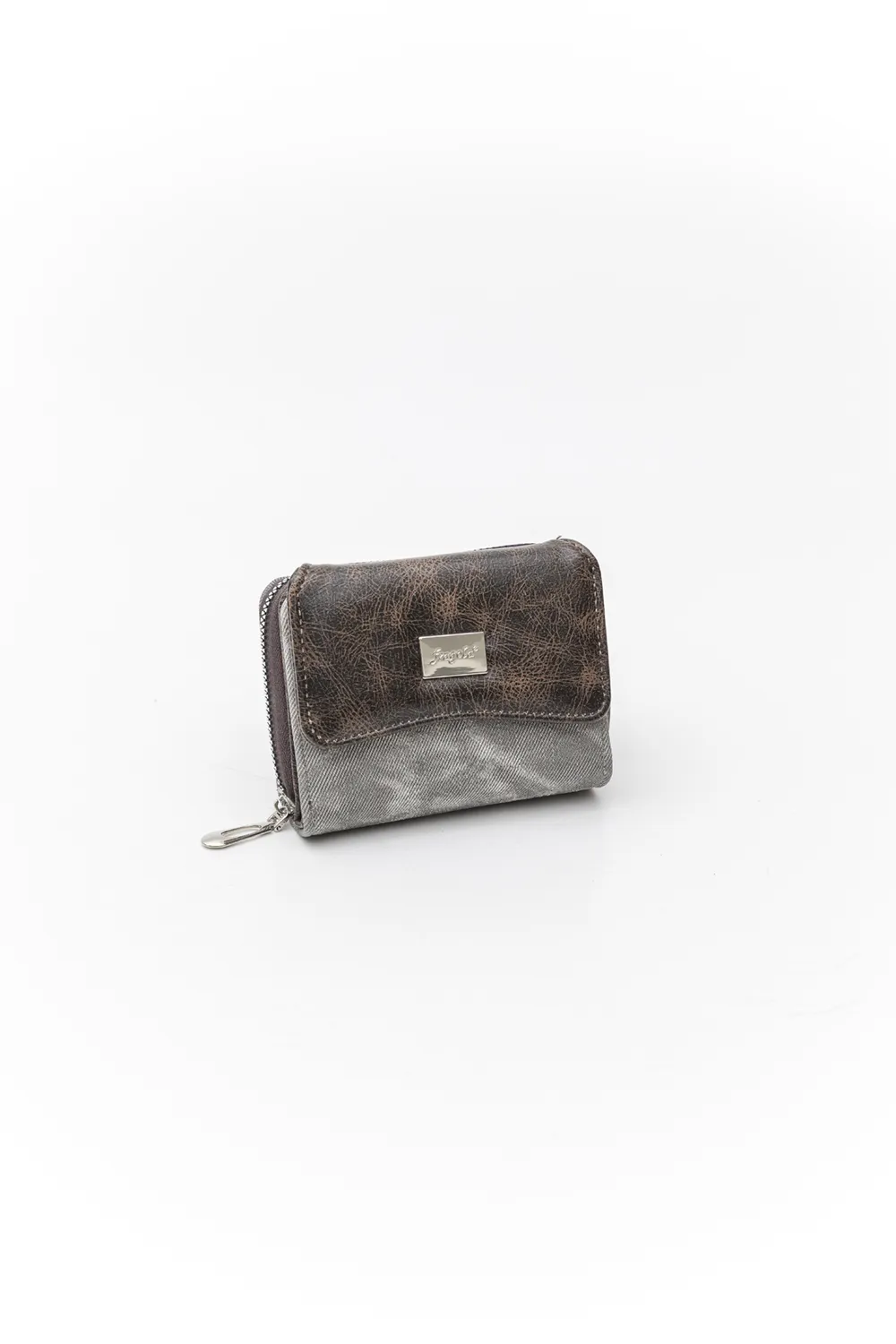 Μικρό πορτοφόλι με καπάκι με μαγνητικό button. Στο εσωτερικό υπάρχουν πολλές θήκες για κάρτες και έξτρα μεγάλες θέσεις για την ταυτότητα και τις σημειώσεις σας. Διαχωρισμένη θήκη με φερμουάρ και άλλη μια θέση που κλείνει με φερμουάρ.Υλικό: Vintage οικολογικό δέρμα συνδυασμένο με απομίμηση jean υφάσματος σε οικολογικό δέρμα ή ματ οικολογικό δέρμα.