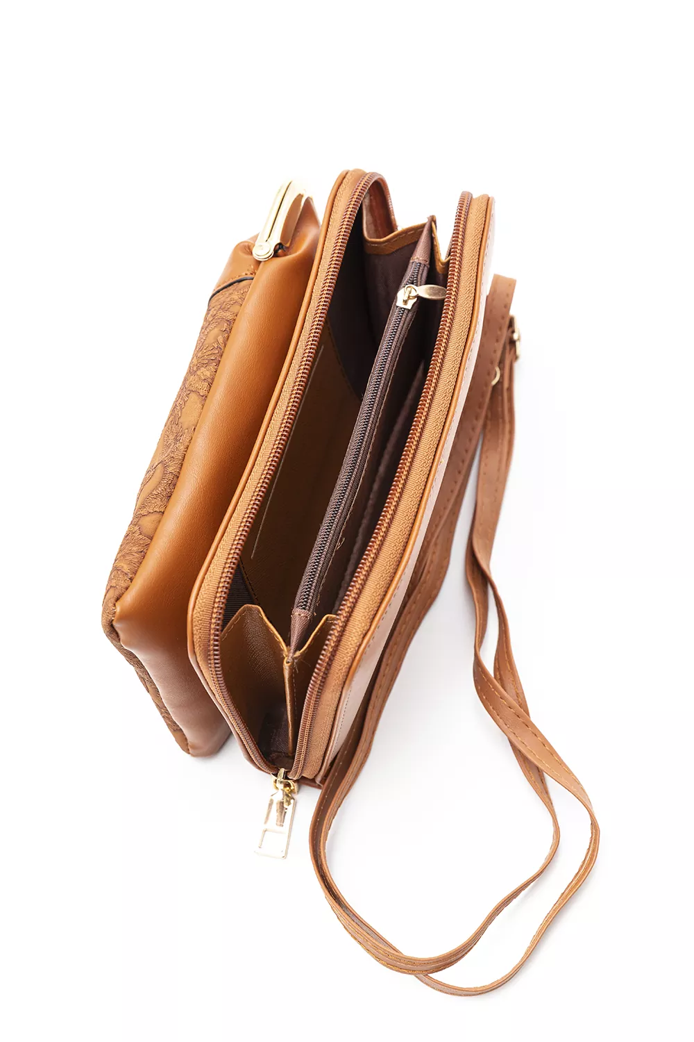 Πορτοφόλι τσαντάκι με extra χεράκι για χιαστί κράτημα. Διαθέτει μια διαχωρισμένη εξωτερική θέση για το κινητό, που κλείνει με μεταλλικό στόμιο, από τη μια πλευρά. Από την άλλη διαθέτει πορτοφόλι με θέση για κέρματα, χαρτονομίσματα και πολλές θέσεις για κάρτες. Κλείνει με φερμουάρ.Υλικό: Συνθετικό δέρμα