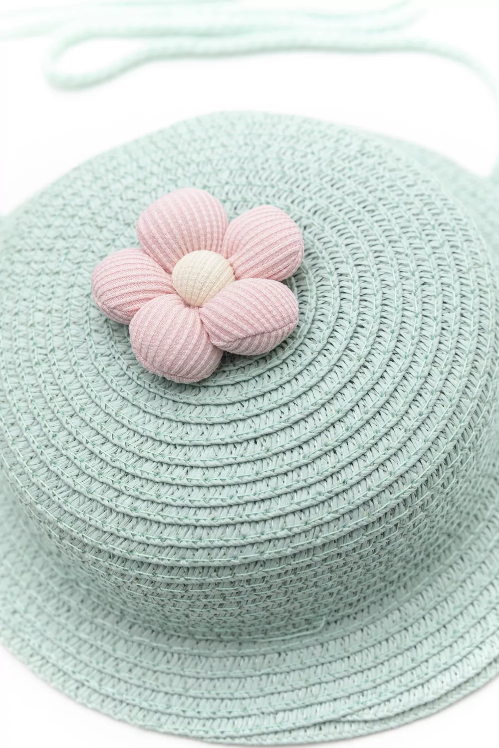 Ιδιαίτερο παιδικό ψάθινο τσαντάκι σε σχήμα καπέλου υπέροχα διακοσμημένο! Κλείνει με βέλκρο.