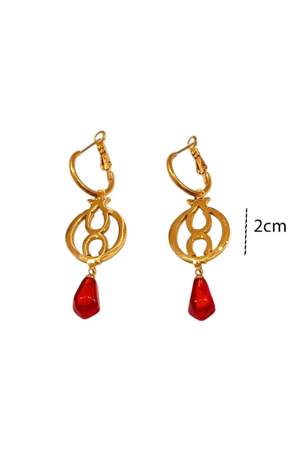 Εντυπωσιακά ατσάλινα σκουλαρίκια με χρυσή απόχρωση και κόκκινες σταγόνες που θυμίζουν ρόδι — σύμβολο τύχης και αφθονίας. Κομψά και λαμπερά, ιδανικά για τις γιορτινές εμφανίσεις ή ως γούρι για τη νέα χρονιά. Ανθεκτικά, υποαλλεργικά και διαχρονικά!