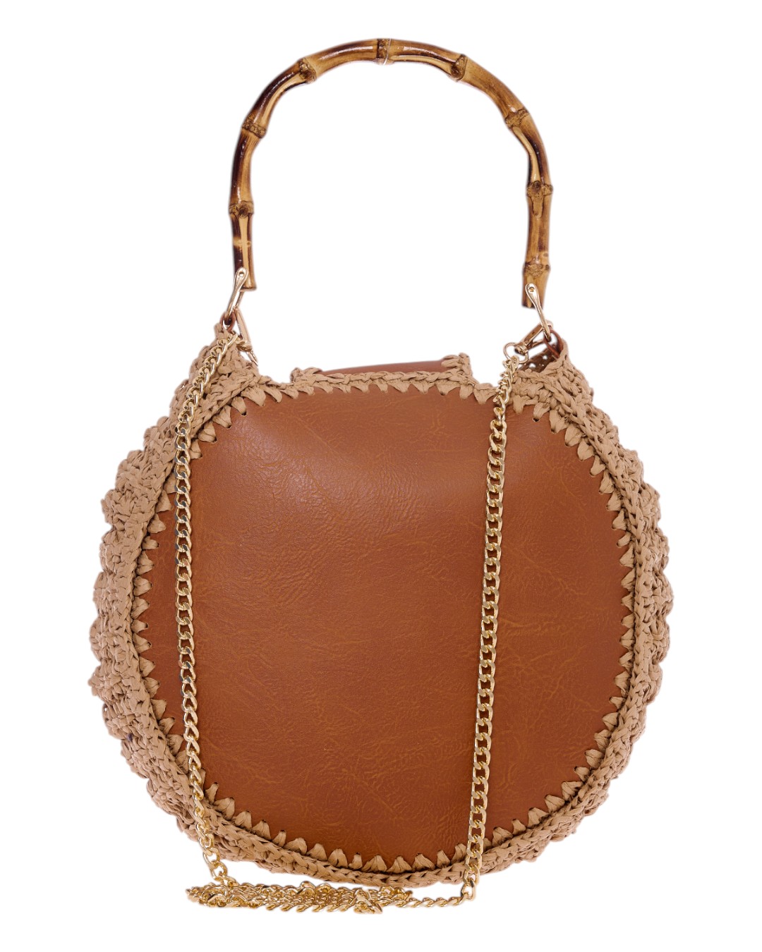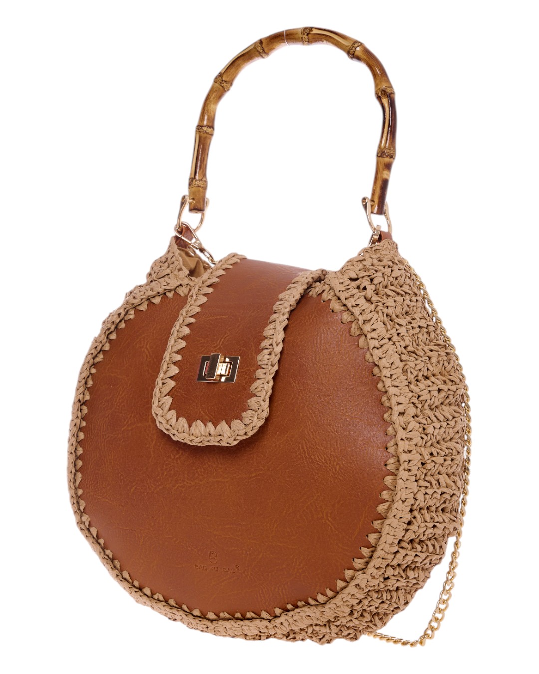 Ψάθινη τσάντα ώμου. Αποτελείται από έναν κύριο χώρο που κλείνει πρώτα με φερμουαρ κ έπειτα με καπάκι που διαθέτει περίτεχνο κούμπωμα. Διαθέτει αποσπώμενη αλυσίδα. • Πλάτος: 3 cm• Μήκος: 35 cm• Ύψος: 33 cm