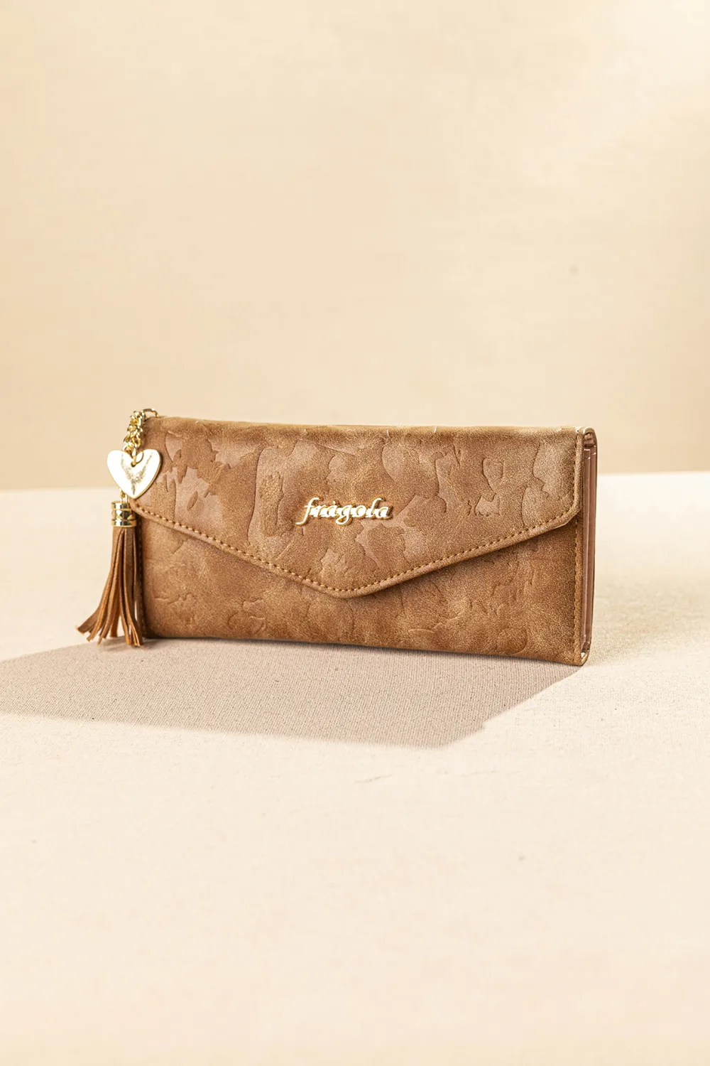 Πορτοφόλι φάκελος με εσωτερική τσέπη με φερμουάρ για τα κέρματα. Θέσεις χαρτονομισμάτων, καρτών και διαφόρων εγγράφων. Κλείνει με σούστα.Οι διακοσμητικές λεπτομέρειες με τη φούντα από το υλικό του πορτοφολιού αλλά και τη μεταλλική καρδούλα το κάνουν χαριτωμένο και ξεχωριστό.Υλικό: Συνθετικό δέρμα