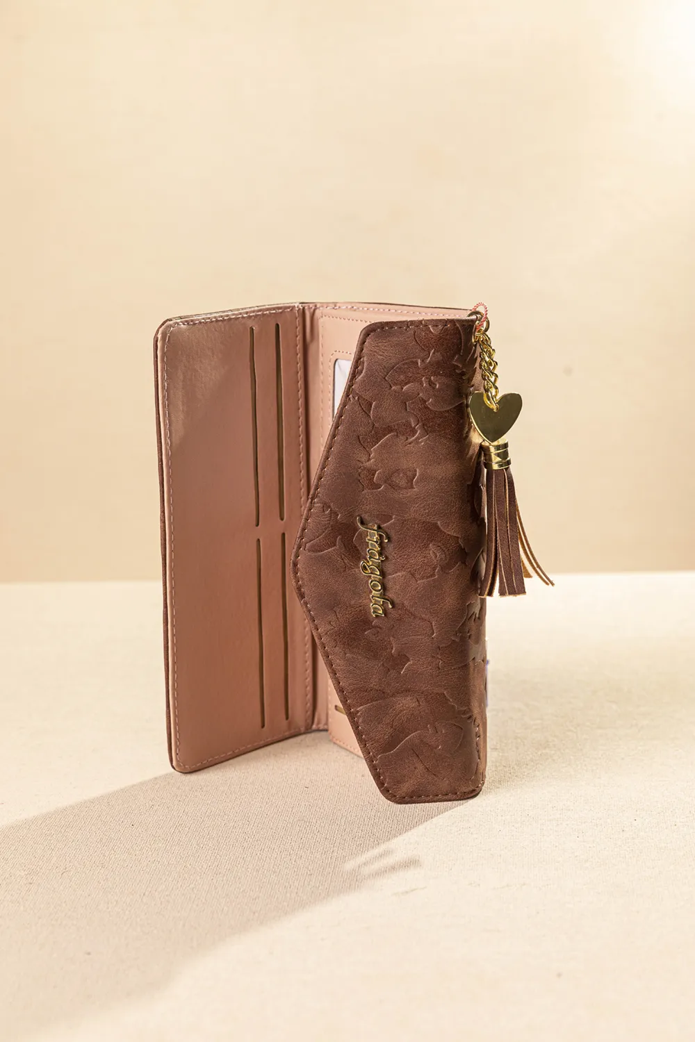 Πορτοφόλι φάκελος με εσωτερική τσέπη με φερμουάρ για τα κέρματα. Θέσεις χαρτονομισμάτων, καρτών και διαφόρων εγγράφων. Κλείνει με σούστα.Οι διακοσμητικές λεπτομέρειες με τη φούντα από το υλικό του πορτοφολιού αλλά και τη μεταλλική καρδούλα το κάνουν χαριτωμένο και ξεχωριστό.Υλικό: Συνθετικό δέρμα