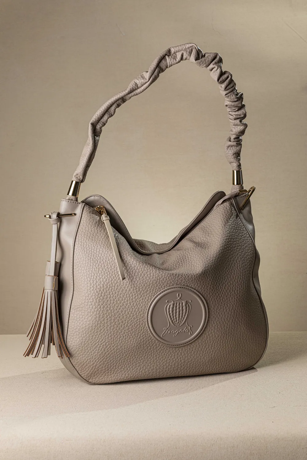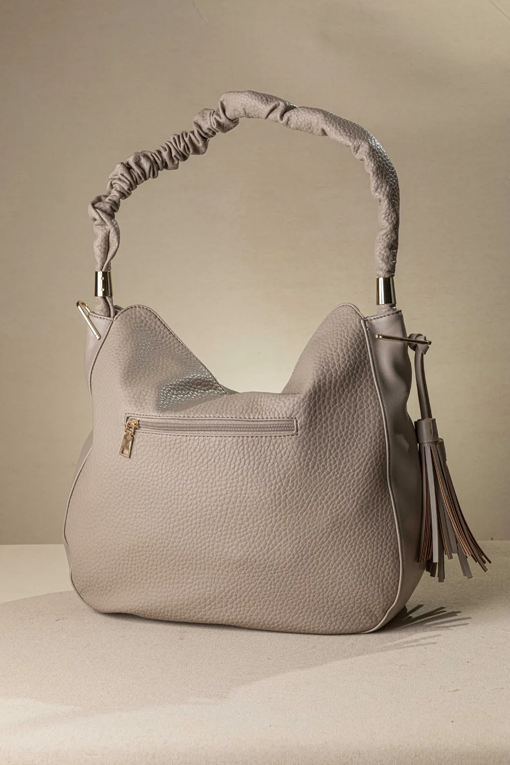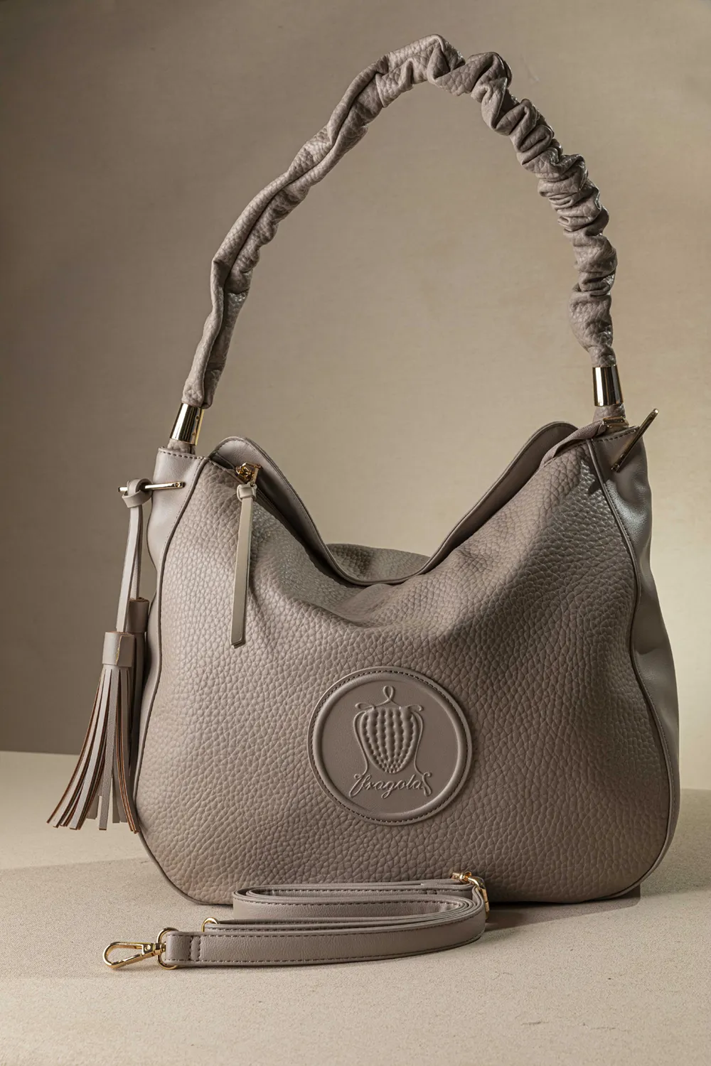 Μεγάλη μαλακή τσάντα που κλείνει με φερμουάρ κατάλληλη για όλη τη μέρα. Στο εσωτερικό της υπάρχει διαχωριστικό με φερμουάρ, το κλασικό τσεπάκι με φερμουάρ και όλα τα βοηθητικά τσεπάκια για τα μικροαντικείμενα σας. Στο πίσω μέρος της υπάρχει τσέπη με φερμουάρ. Η τσάντα διαθέτει δεξιά και αριστερά μεταλλικά εξαρτήματα τα οποία λειτουργούν σαν διακοσμήτικά αλλά και για να εφαρμοστεί το μακρύ χέρι της και να μετατραπεί σε χιαστί. Το χέρι για τον ώμο είναι από μαλακή δερματίνη και είναι πλισσαρισμένο σε χοντρό κορδόνι.
