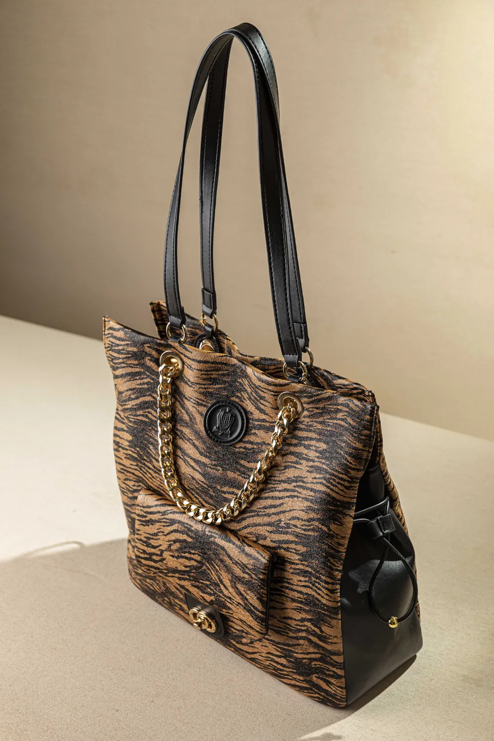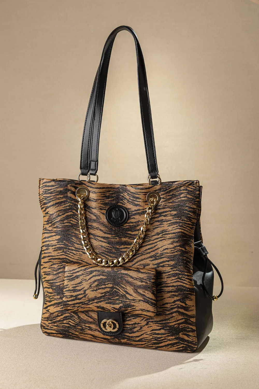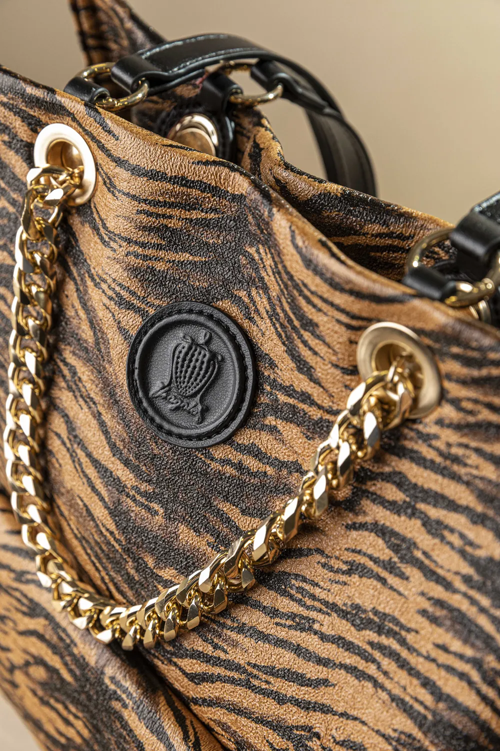 Μια πανάλαφρη τσάντα ώμου και χερός που κλείνει με μαγνητικό button. Διαθέτει "χεράκια" δερματίνης για τον ώμο αλλά και κοντές αλυσίδες για κράτημα στο χέρι αλλά και για έξτρα στιλ. Στο μπροστά μέρος της διαθέτει τσεπάκι που κλείνει με μεταλλική κλειδαριά. Ένας ενιαίος χώρος εσωτερικά που διαθέτει όλα τα κλασικά μικροτσεπάκια με φερμουάρ και χωρίς. Με έξυπνη αυξομείωση του φάρδους της τσάντας από τα πλαινά της μέρη. Υλικό: Συνθετικό δέρμα με υφή και print φιδιού και tiger print.