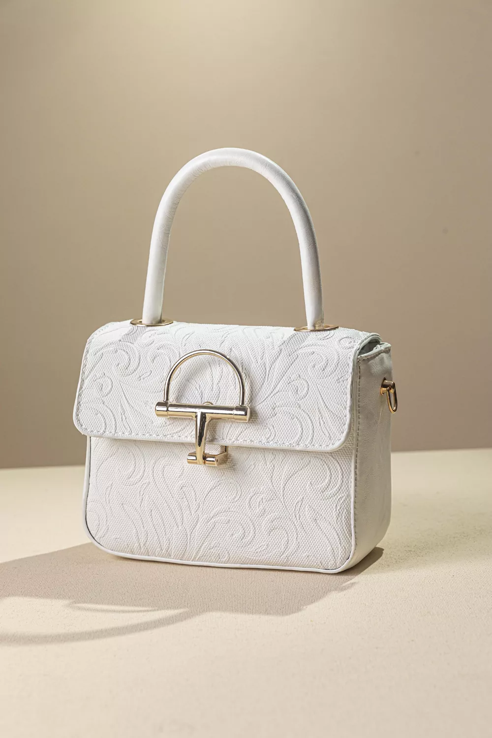 • Διαθέτει εντυπωσιακό μεταλλικό κούμπωμα σε χρυσό τόνο. Εκτός από το κοντό σταθερό χέρι περιλαμβάνει μακρύ χέρι για χιαστί κράτημα.