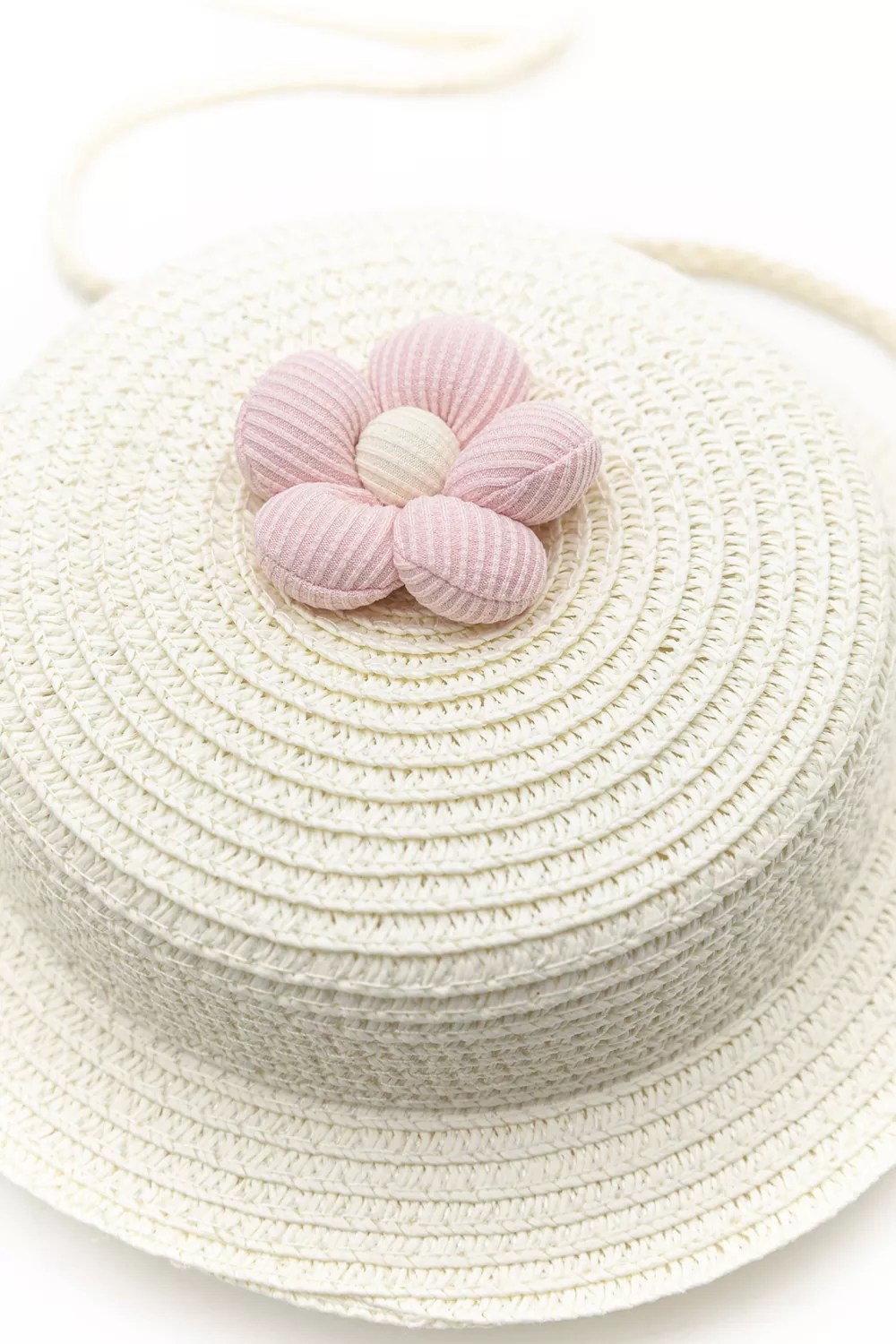 Ιδιαίτερο παιδικό ψάθινο τσαντάκι σε σχήμα καπέλου υπέροχα διακοσμημένο! Κλείνει με βέλκρο.