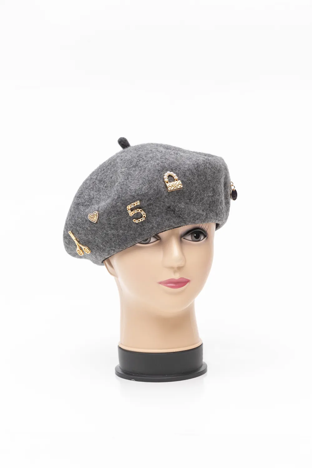 Γυναικείο μπερέ από ακρυλική τσόχα. Μεταλλικά διακοσμητικά στοιχεία του προσθέτουν μια πιο glamourous εμφάνιση. Συνδιάζεται άνετα με κάθε outfit.