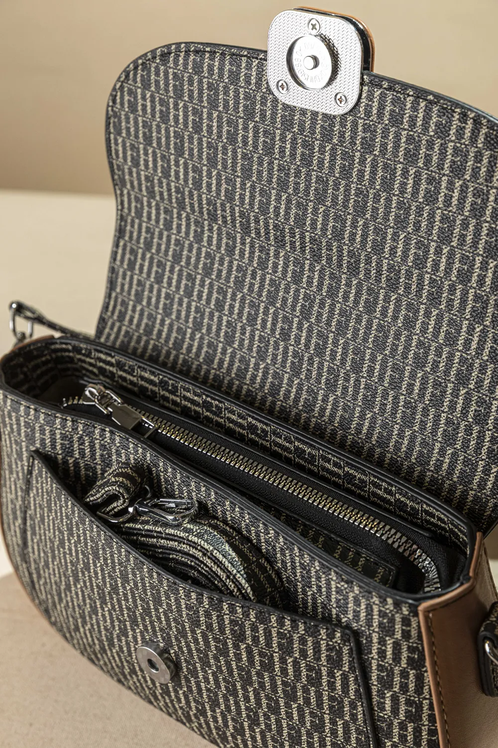 Τσαντάκι ώμου με καπάκι που κλείνει με ιδιαίτερο μαγνητικο μπουτόν και φερμουάρ κάτω από αυτό. Στο εξωτερικό μπροστά μέρος κάτω από το καπάκι διαθέτει έξτρα θέση. Ενιαίος εσωτερικός χώρος με μια έξτρα τσέπη με φερμουάρ για αποθήκευση μικροαντικειμένων. Η τσάντα διαθέτει έξτρα μακρύ "χεράκι" που μετατρέπεται σε χιαστί. Υλικό: Συνθετικό δέρμα με ανάγλυφη υφή ή logo print.
