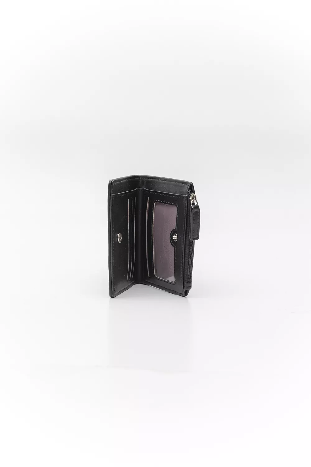 Μικρό πορτοφόλι που κλείνει με κουμπάκι. Στο εσωτερικό υπάρχουν πολλές θήκες για κάρτες και ξεχωριστή θήκη με φερμουάρ.Υλικό: Οικολογικό δέρμα με ανάγλυφο το λογότυπο της εταιρίας σε mirror printing.