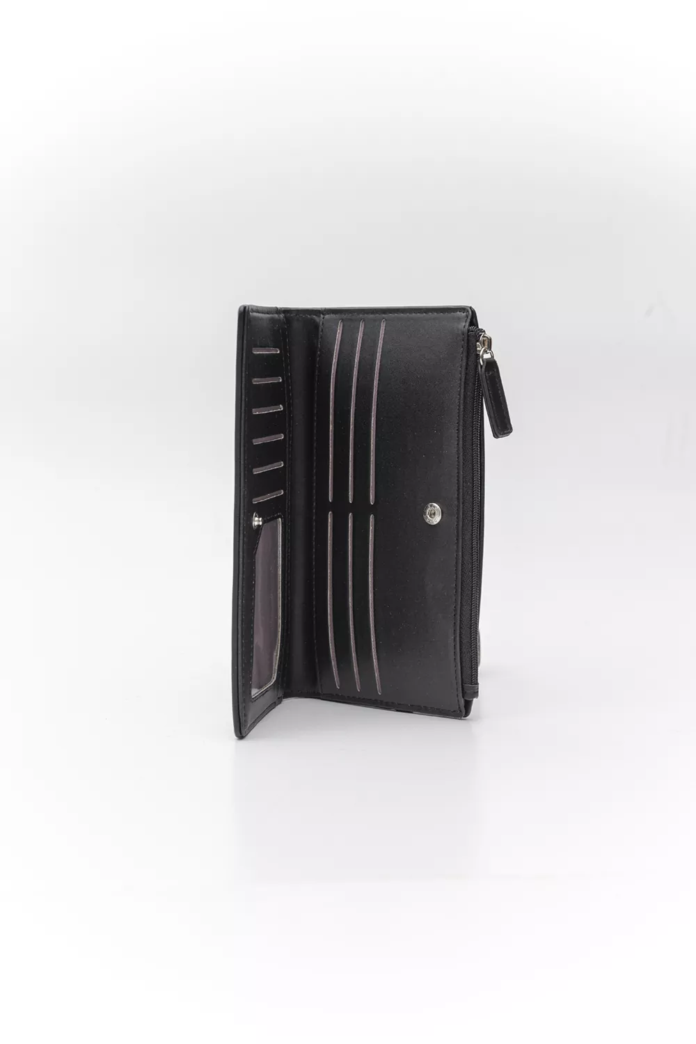Μεγάλο πορτοφόλι που κλείνει με κουμπάκι. Στο εσωτερικό υπάρχουν πολλές θήκες για κάρτες και ξεχωριστή θήκη με φερμουάρ.Υλικό: Οικολογικό δέρμα με ανάγλυφο το λογότυπο της εταιρίας σε mirror printing.