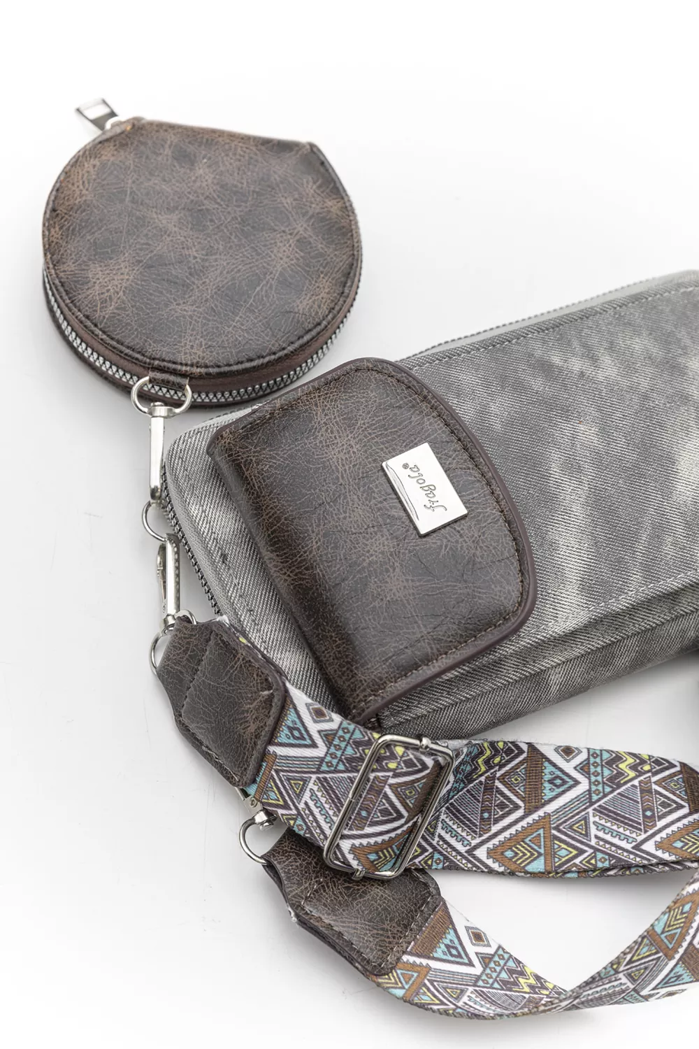 Χιαστί τσαντάκι δύο όψεων (κινητό-πορτοφόλι). Η μια όψη είναι θέση κινητού με καπάκι. Η δεύτερη όψη είναι πορτοφόλι με όλους τους απαραίτητους χρηστικούς χώρους . Συμπεριλαμβάνει έξτρα στρόγγυλη θήκη με φερμουάρ για usb, ακουστικά κλπ.Υλικό: Vintage οικολογικό δέρμα συνδυασμένο με απομίμηση jean υφάσματος σε οικολογικό δέρμα.