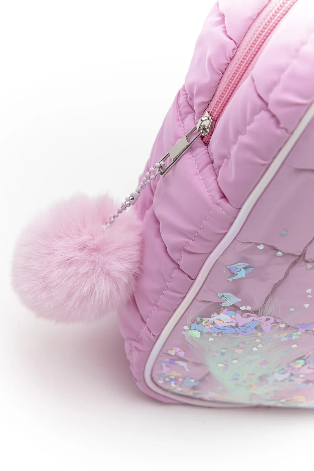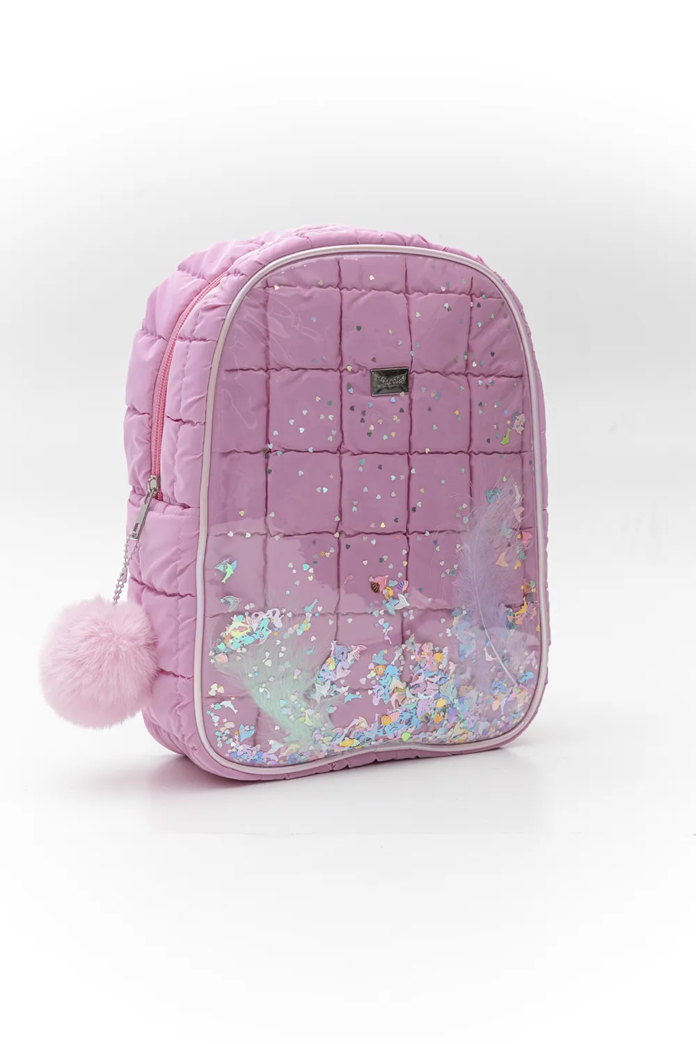 Παιδικό puffer σακίδιο σε μεταλλικά χρώματα. Στο μπροστιινό μέρος τους είναι διακοσμημένο με πούπουλα και μεταλλικά κομφετί τα οποία καλύπτονται από διάφανο pu. Κλείσιμο με φερμουάρ και ιδιαίτερο γούνινο τελείωμα.Υλικό: Puffer αδιάβροχο