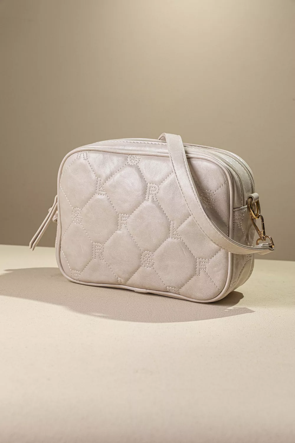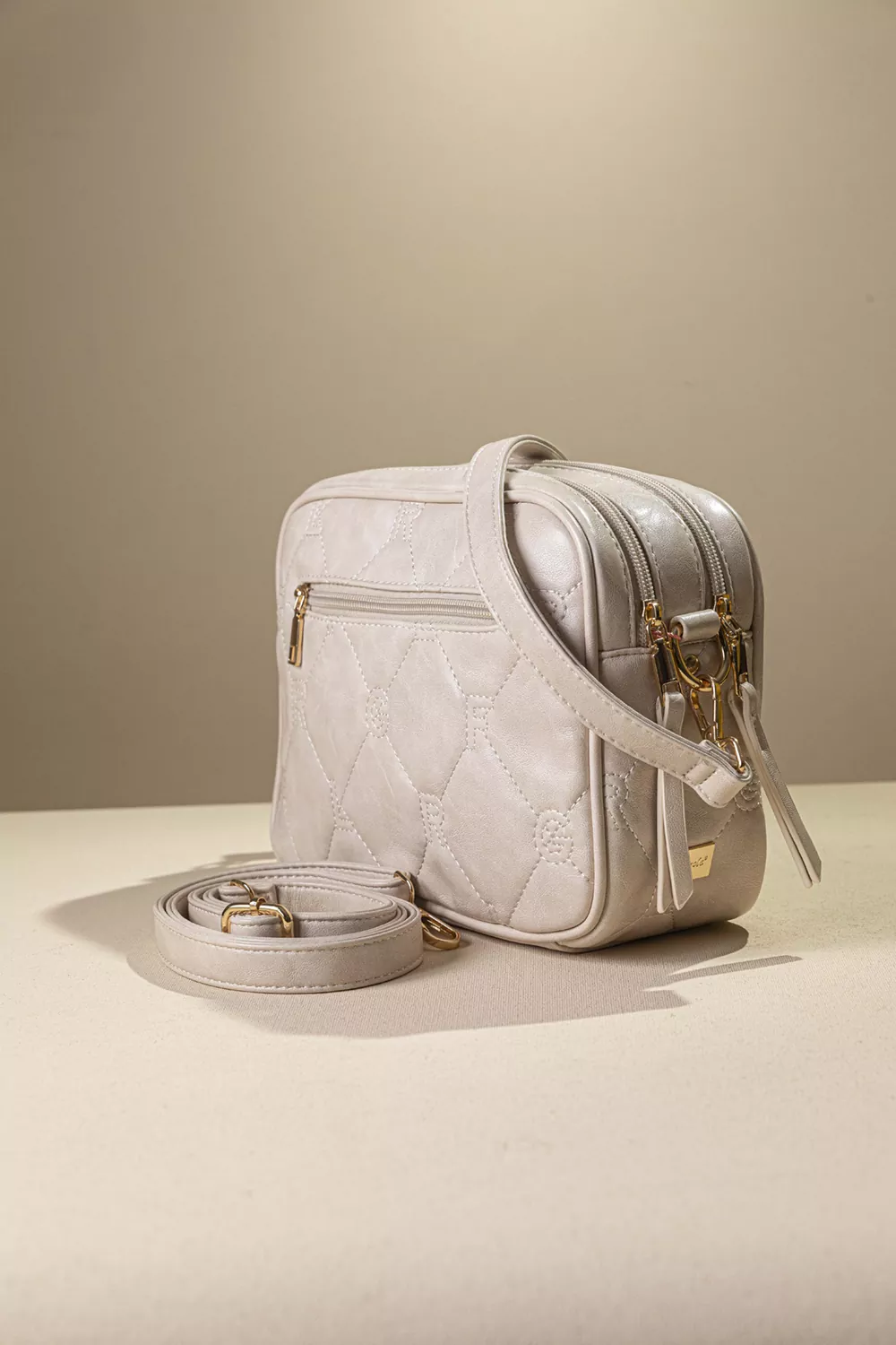 • Τριθέσια κομψή τσάντα χειρός με ιδιέτερη καπιτονέ υφή και όψη παλαιομένου δέρματος που εμφανίζει τα γράμματα της εταιρίας με χρυσό εντυπωσιακό κλείσιμο.
