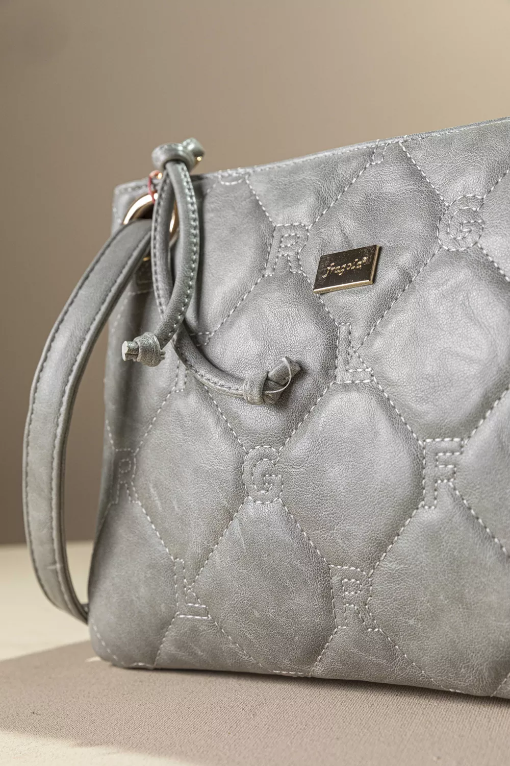 Υλικό: Μαλακό συνθετικό δέρμα με παλαιωμένη όψη και καπιτονέ γαζιά που απεικονίζουν τα γράμματα της εταιρείας.