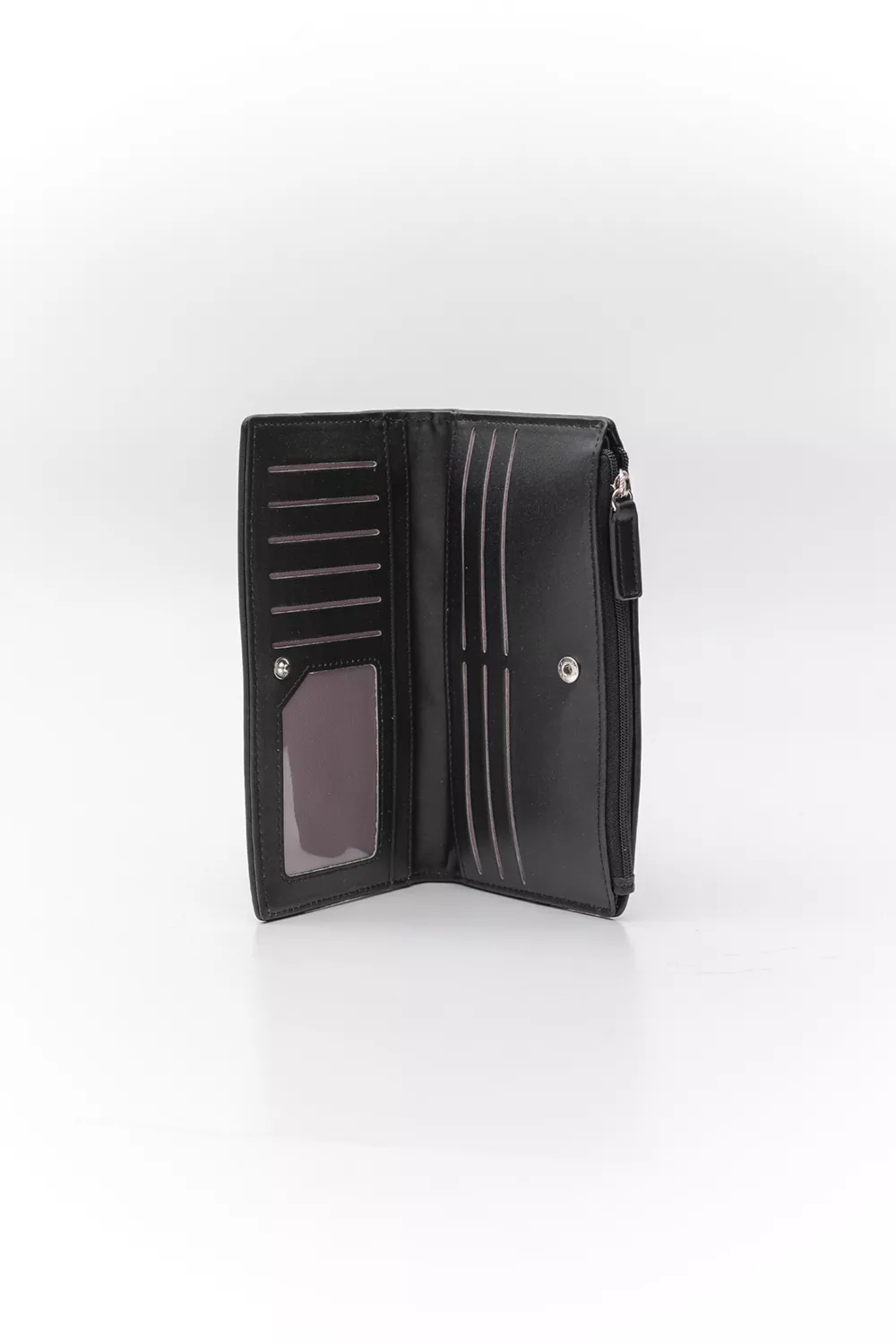 Μεγάλο πορτοφόλι που κλείνει με κουμπάκι. Στο εσωτερικό υπάρχουν πολλές θήκες για κάρτες και ξεχωριστή θήκη με φερμουάρ.Υλικό: Οικολογικό δέρμα με ανάγλυφο το λογότυπο της εταιρίας σε mirror printing.