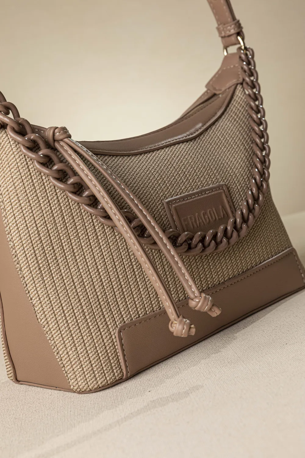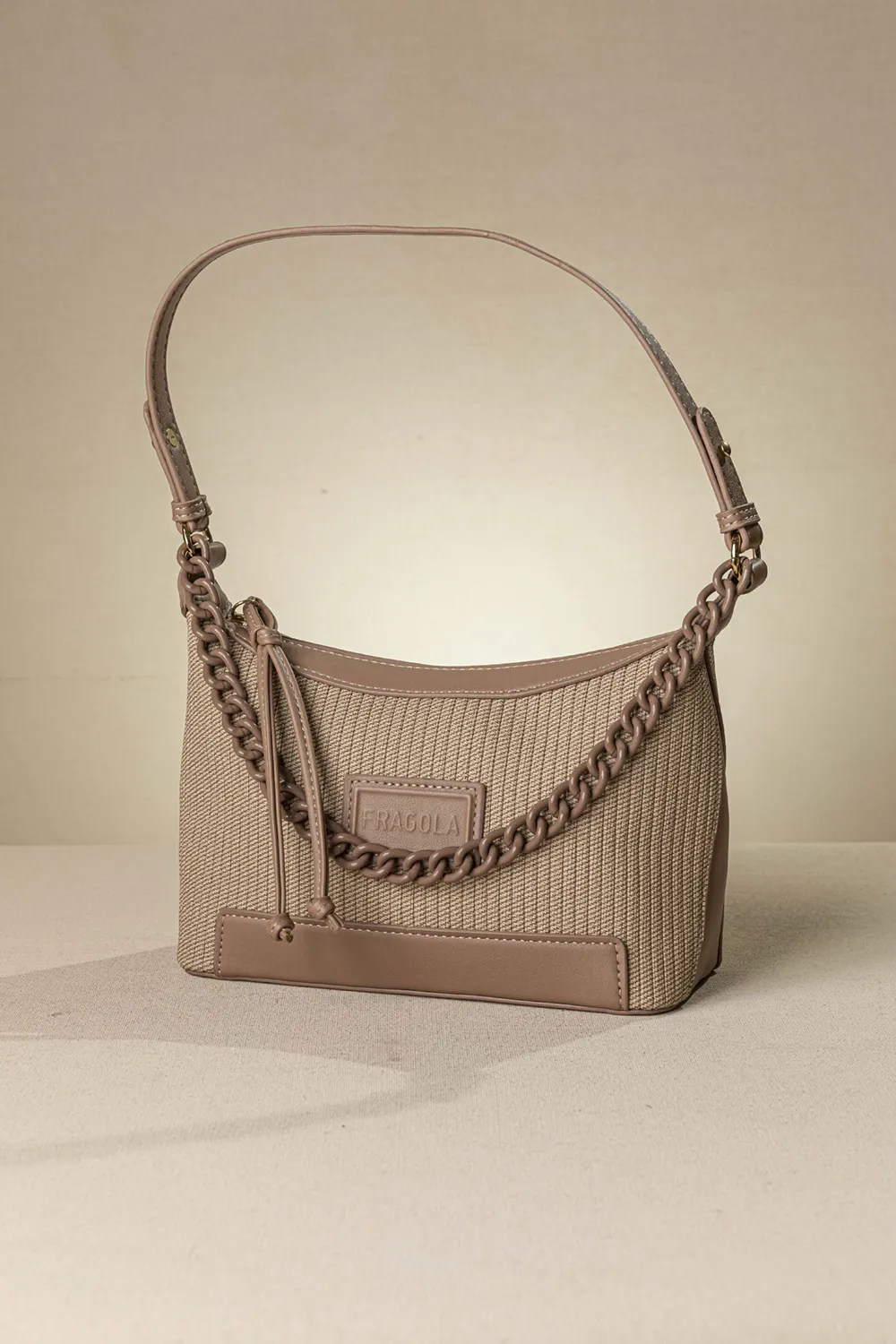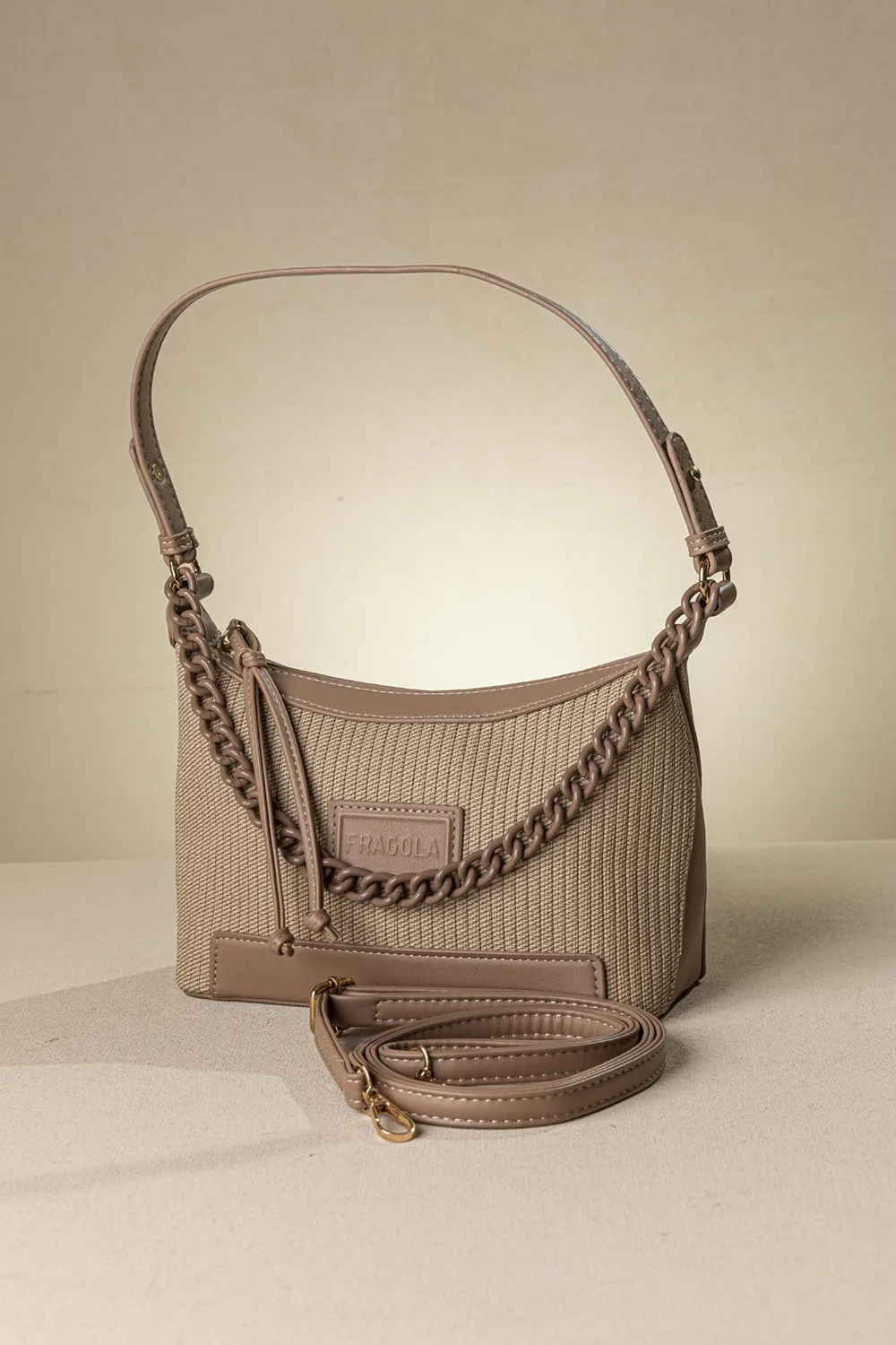 Τσαντάκι ώμου κατάλληλη για όλες τις ώρες της ημέρας αλλά και για όλες τις ηλικίες. Μια βαμμένη αλυσίδα στο μπροστινό της μέρος της δίνει έξτρα στιλ! Ένας ενιαίος χώρος που κλείνει με φερμουάρ και στο εσωτερικό της διαθέτει μια μικρή τσέπη με φερμουάρ. Επίσης διαθέτει έξτρα "χεράκι" για να μετατραπεί η τσάντα σε χιαστί.Υλικό: Συνθετικό δέρμα με υφή υφάσματος.
