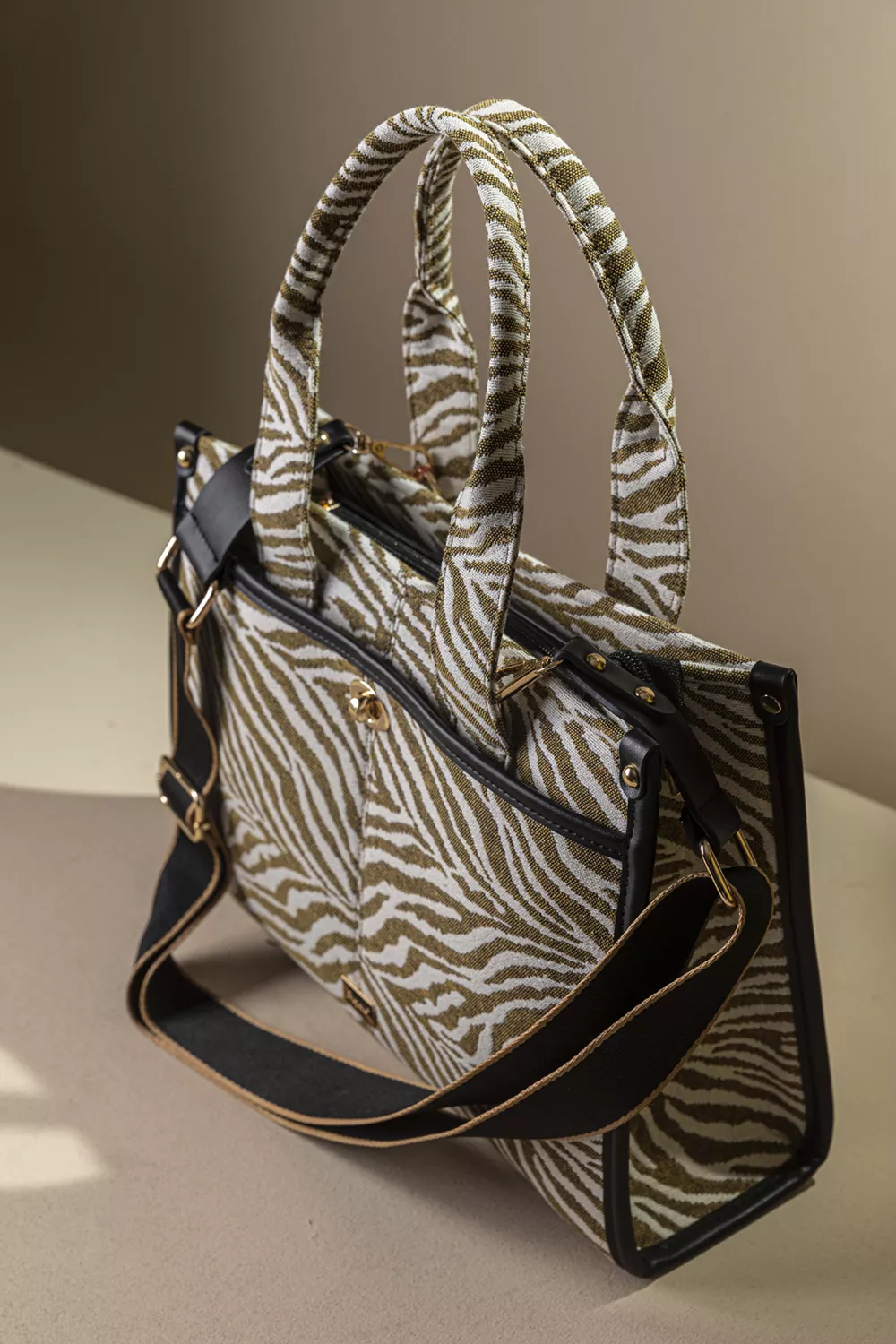 • Κομψή και μοντέρνα υφασμάτινη τσάντα, με εντυπωσιακά υφάσματα σε animal prints. Ιδανική για να δώσει χαρακτήρα σε κάθε σου εμφάνιση.