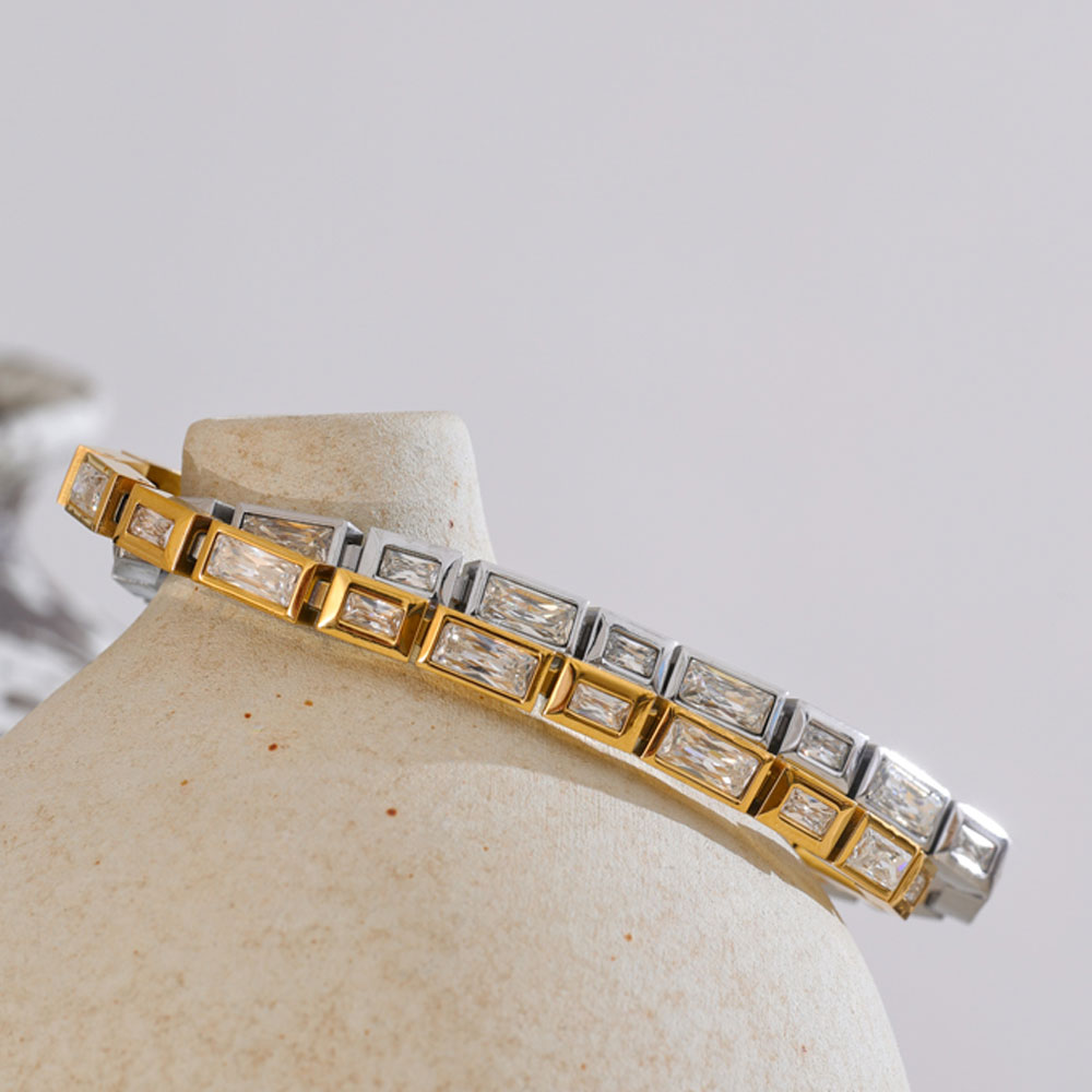 Κομψό βραχιόλι από ανοξείδωτο ατσάλι σε χρυσή απόχρωση, διακοσμημένο με ορθογώνιες λαμπερές πέτρες που προσθέτουν διακριτική πολυτέλεια και μοντέρνο χαρακτήρα. Το συνολικό μήκος 16+5 cm προσφέρει άνετη και εύκολη εφαρμογή για κάθε καρπό.