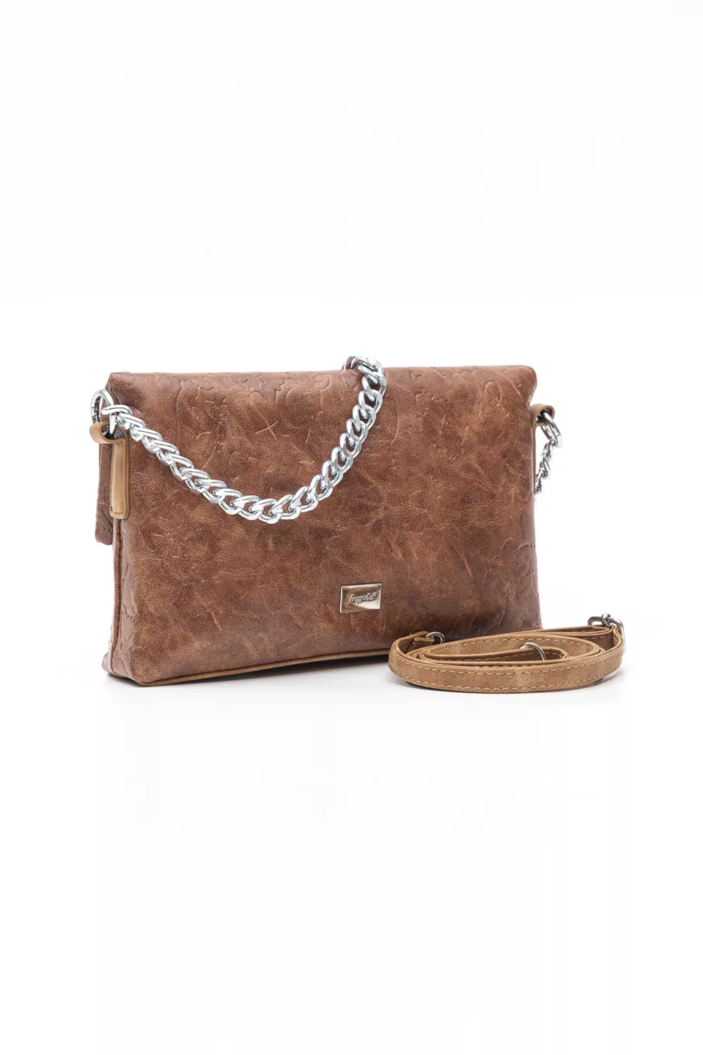 Soft μεσαία τσάντα πολυχρηστική καθώς μπορεί να κρατηθεί σαν φάκελος, χιαστί ή στον ώμο. Εντυπωσιακή φιγούρα ντυμένη με υλικό. Διπλώνει και κλείνει με δεύτερα μαγνητικά button. Βοηθητικές μικρές θέσεις στο εσωτερικό της τσάντας και μια βοηθητική τσέπη με φερμουάρ στο πίσω μέρος της. Διαθέτει αλυσίδα για τον ώμο και έξτρα χεράκι για χιαστί.Υλικό: Συνθετικό δέρμα σταμπωμένο με πυρογραφία με ανάγλυφο αποτέλεσμα.