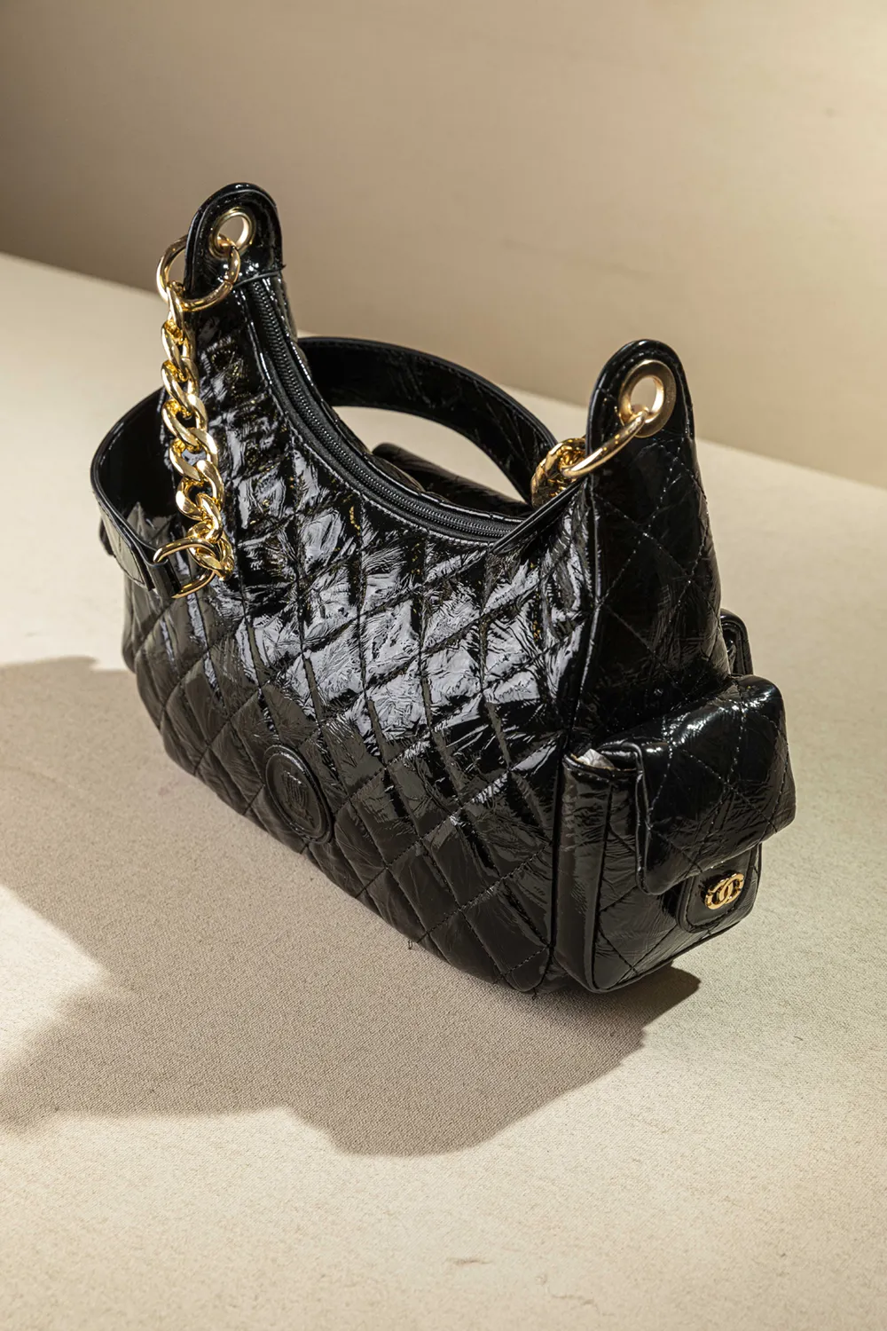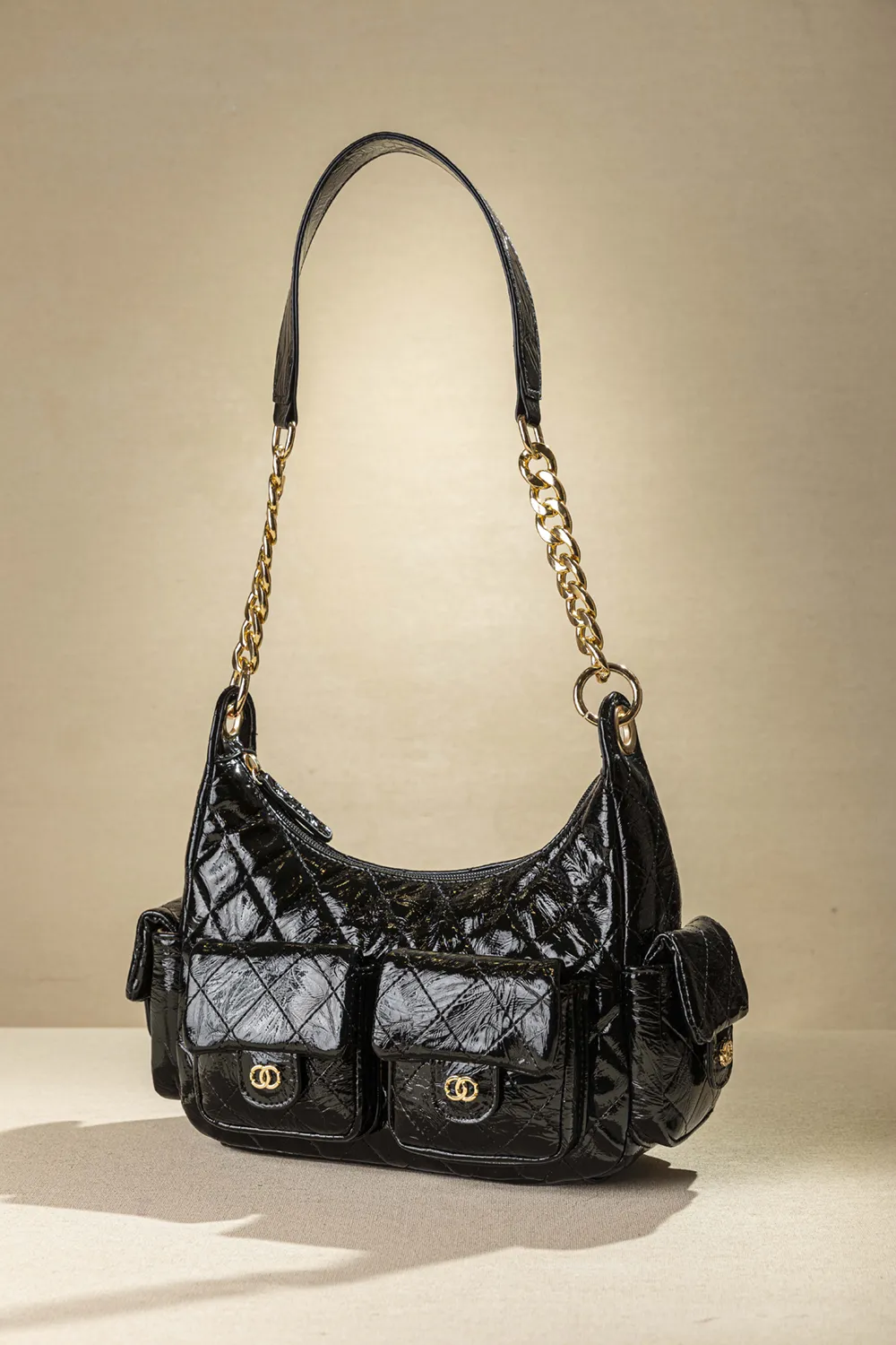 Μαλακή τσάντα ώμου για όλη τη μέρα σας αλλά και τις βόλτες σας! Εξωτερικά έχει τέσσερις τσέπες που κλείνουν με καπάκι με μαγνητικό Button. Διαθέτει κοντό "χεράκι" με χοντρή τροχισμένη αλυσίδα και δερματίνη, όπως επίσης διαθέτει έξτρα αυξομειούμενο "χεράκι" για να μετατρέψετε την τσάντα σε χιαστί. Υλικό: Μαλακό συνθετικό δέρμα με γαζιά.