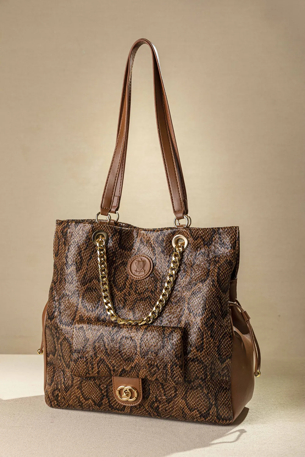 Μια πανάλαφρη τσάντα ώμου και χερός που κλείνει με μαγνητικό button. Διαθέτει "χεράκια" δερματίνης για τον ώμο αλλά και κοντές αλυσίδες για κράτημα στο χέρι αλλά και για έξτρα στιλ. Στο μπροστά μέρος της διαθέτει τσεπάκι που κλείνει με μεταλλική κλειδαριά. Ένας ενιαίος χώρος εσωτερικά που διαθέτει όλα τα κλασικά μικροτσεπάκια με φερμουάρ και χωρίς. Με έξυπνη αυξομείωση του φάρδους της τσάντας από τα πλαινά της μέρη. Υλικό: Συνθετικό δέρμα με υφή και print φιδιού και tiger print.