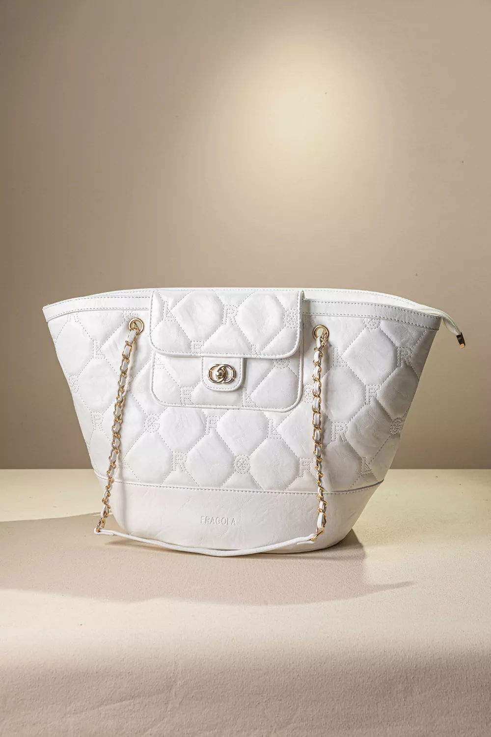 • Καπιτονέ σχέδιο με γαζιά που απεικονίζει τα γράμματα της εταιρείας. Χρυσές μεταλλικές λεπτομέρειες που χαρίζουν πολυτελή εμφάνιση.