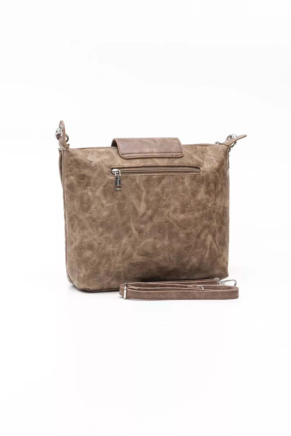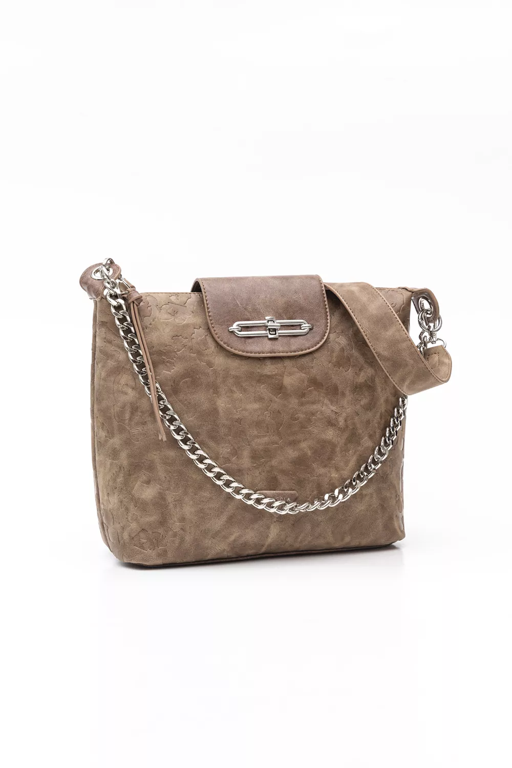 Πολυμορφική τσάντα μεσαίου μεγέθους. Ενιαίος εσωτερικός χώρος με τα βοηθητικά τσεπάκια και εξωτερική βοηθητική τσέπη με φερμουάρ και έξτρα κλείσιμο με μικρό καπάκι με κλειδαριά. Διαθέτει τρία διαφορετικά χέρια. Ένα χέρι ώμου για ολη την ημέρα. Χοντρή αλυσίδα που μπορεί να χρησιμοποιηθεί είτε ως διακοσμητικό της τσάντας είτε ως χέρι ώμου για βραδινή έξοδο. Τρίτο χέρι με το οποίο μπορεί να κρατηθεί χιαστί.Υλικό: Συνθετικό δέρμα σταμπωμένο με πυρογραφία με ανάγλυφο αποτέλεσμα.