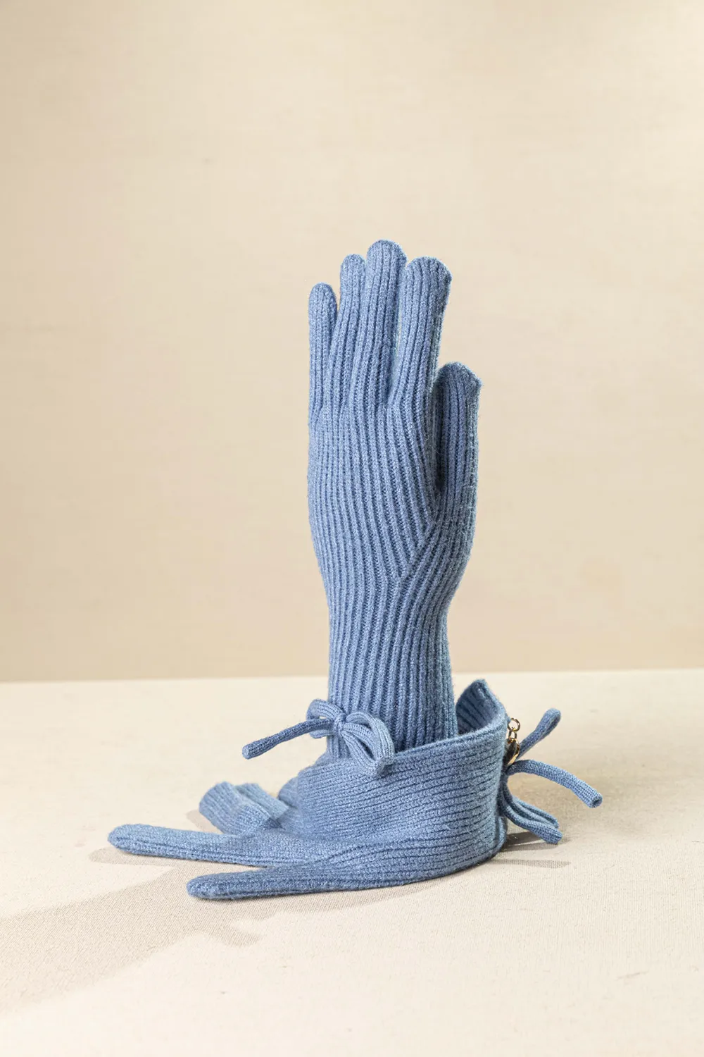 Γυναικείο πλεκτό γάντι, απαλό , κομψό και απόλυτα Χειμερινό. Μαλακό και ζεστό πλεκτό με rib ύφανση για άνετη εφαρμογή. Όμορφος διακοσμητικός φιόγκος στον καρπό για όμορφη θυληκή πινελιά.Εγκοπές στον αντίχειρα και το δείκτη και τον δύο χεριών για χρήση σε οθόνες αφής. Συνδιάζεται εύκολα με παλτό, ζακέτες και φουλάρια.