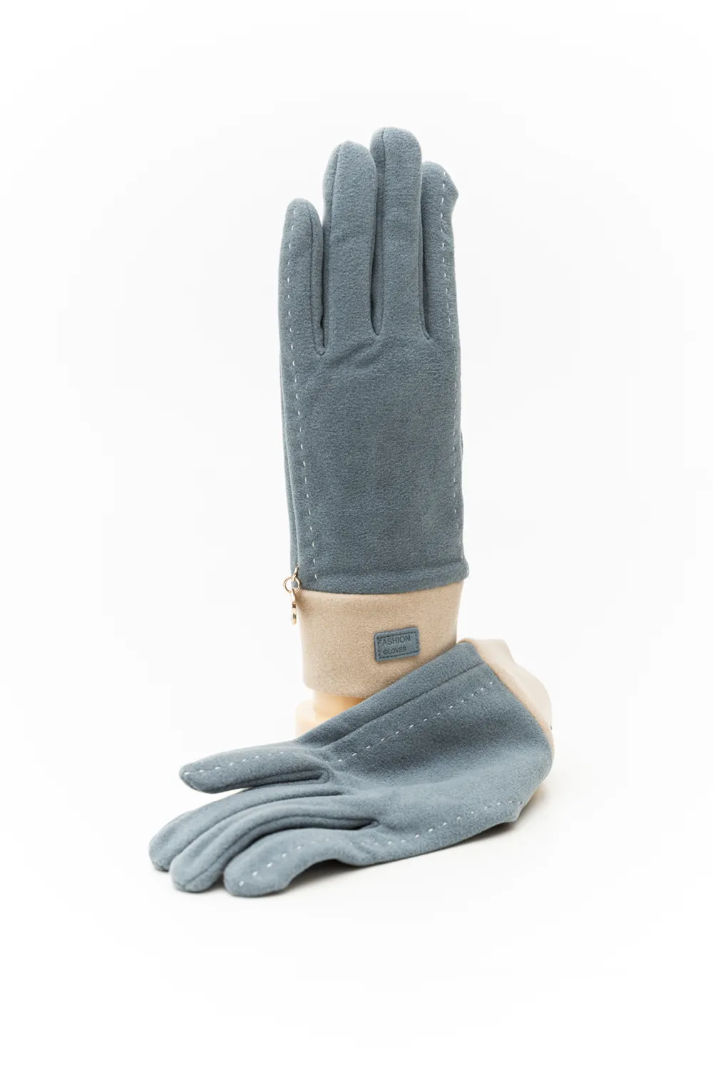Γάντι γυναικείο, ακρυλικό με υφή τσόχας, δύχρωμο ρεβέρ και εσωτερική επένδυση. Διαθέτει ειδικό κέντημα για χρήση σε οθόνες αφής στον δείκτη και τον αντίχειρα και των δύο χεριών.