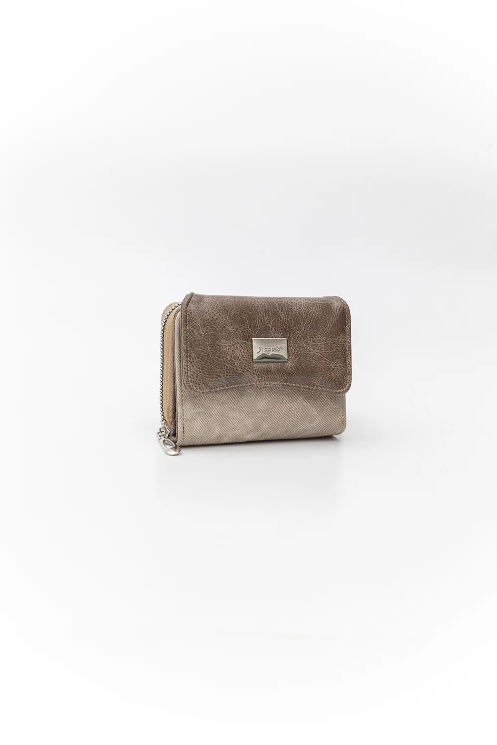 Μικρό πορτοφόλι με καπάκι με μαγνητικό button. Στο εσωτερικό υπάρχουν πολλές θήκες για κάρτες και έξτρα μεγάλες θέσεις για την ταυτότητα και τις σημειώσεις σας. Διαχωρισμένη θήκη με φερμουάρ και άλλη μια θέση που κλείνει με φερμουάρ.Υλικό: Vintage οικολογικό δέρμα συνδυασμένο με απομίμηση jean υφάσματος σε οικολογικό δέρμα ή ματ οικολογικό δέρμα.