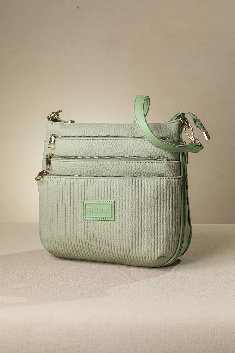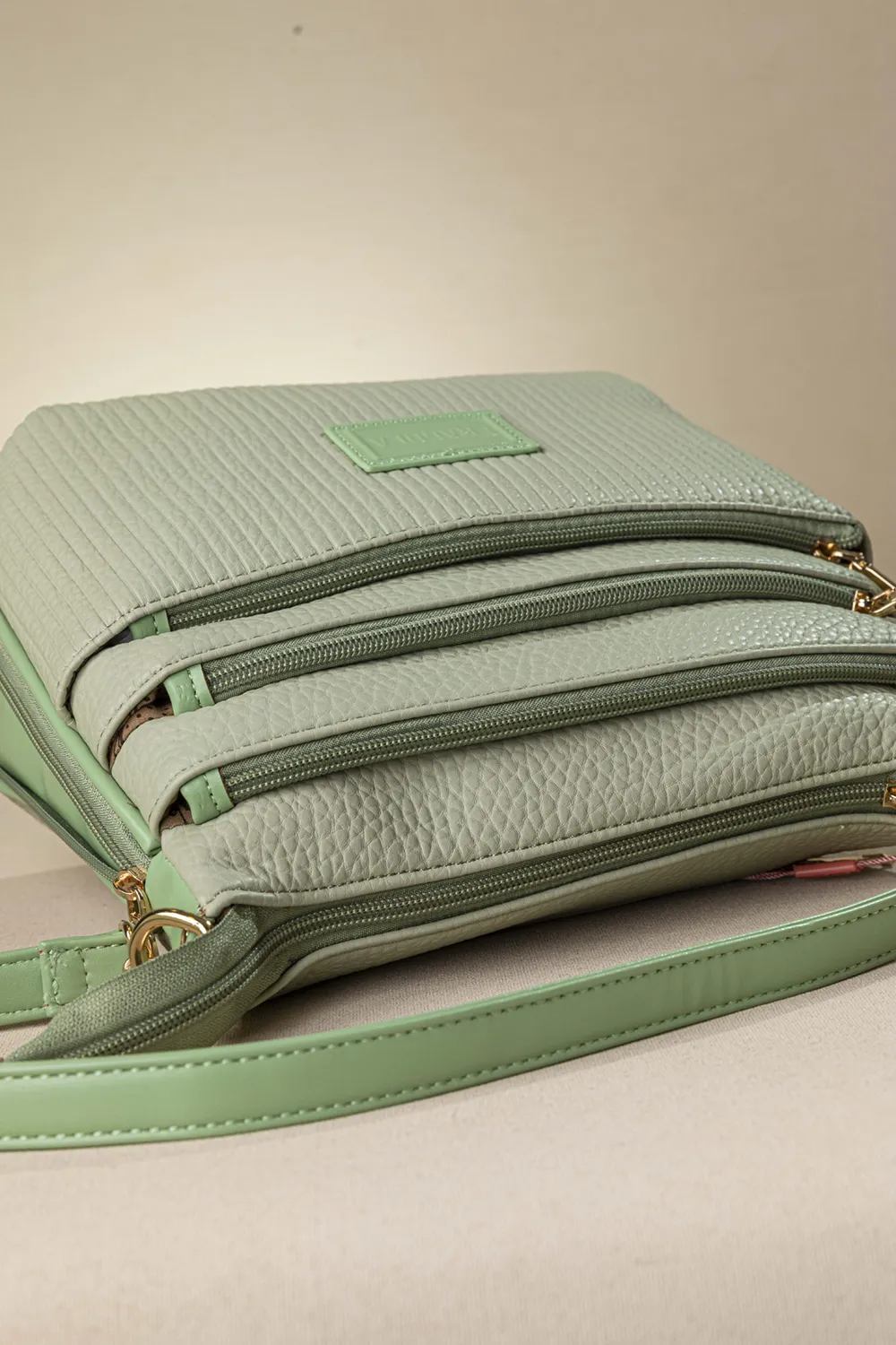 Τρείς ξεχωριστές θέσεις μπροστά που κλείνουν όλες με φερμουάρ. Μια τσέπη με φερμουάρ στο πίσω μέρος. Διαθέτει ένα κοντό χέρι για τον ώμο και ένα μακρύ με αυξομείωση για να τη φοράτε χιαστί.